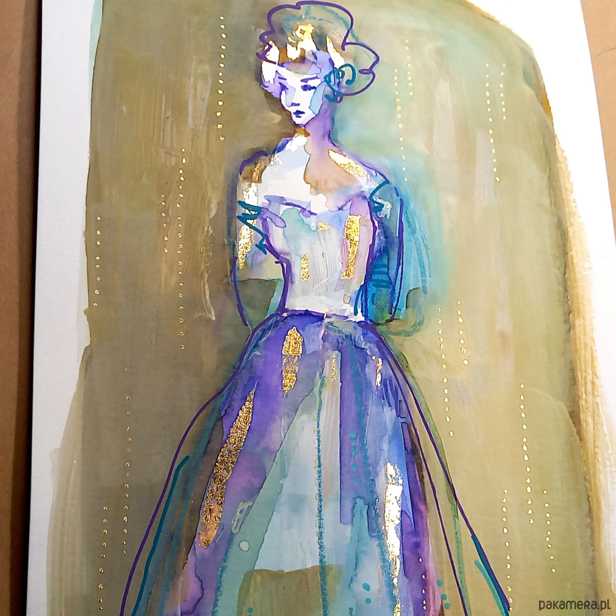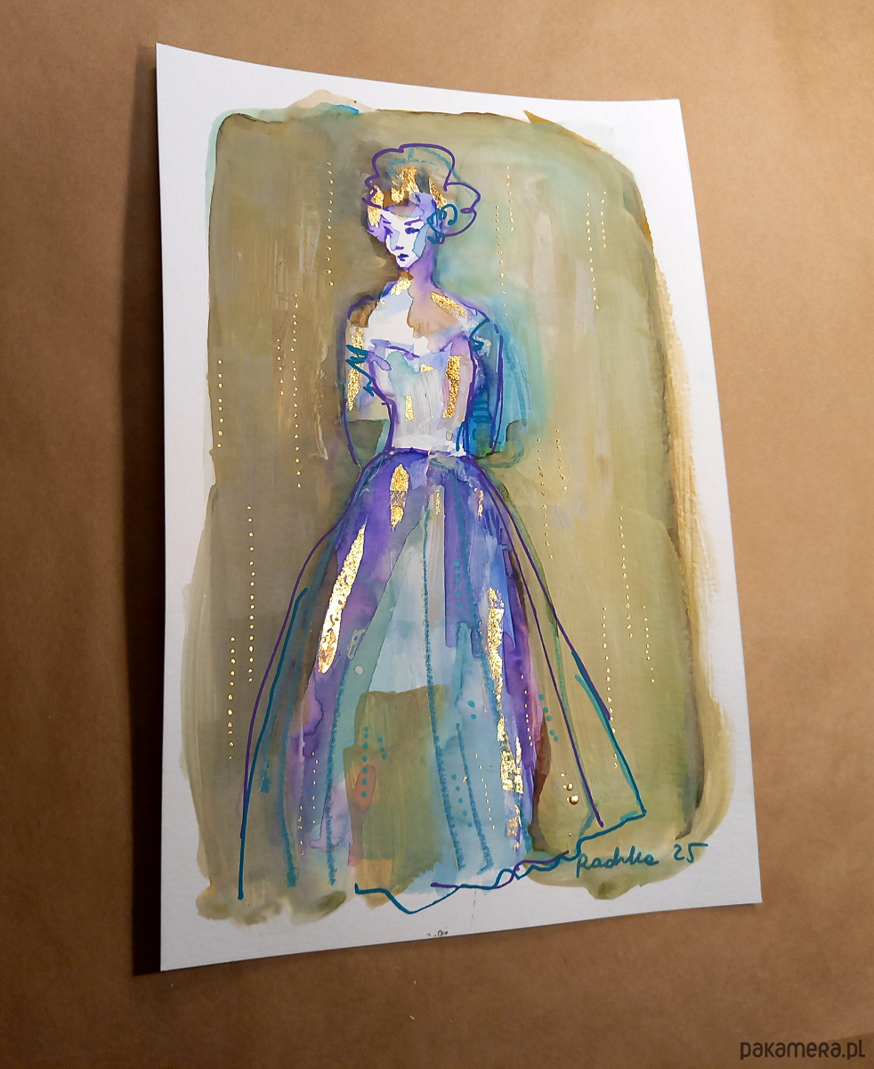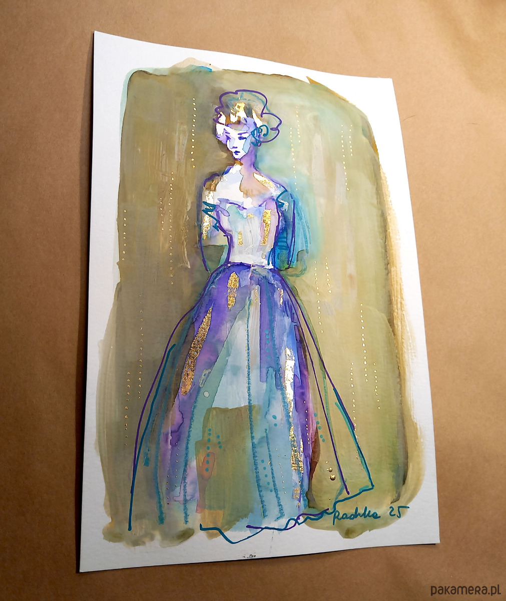 Akwarela formatu 16x24 cm wykonana za pomocą akwareli Talensa, złotych płatków szlagmetalu, z dodatkiem tuszu, akryli oraz kaligraficznych pisaków na profesjonalnym papierze akwarelowym Talens 300 g/m2.