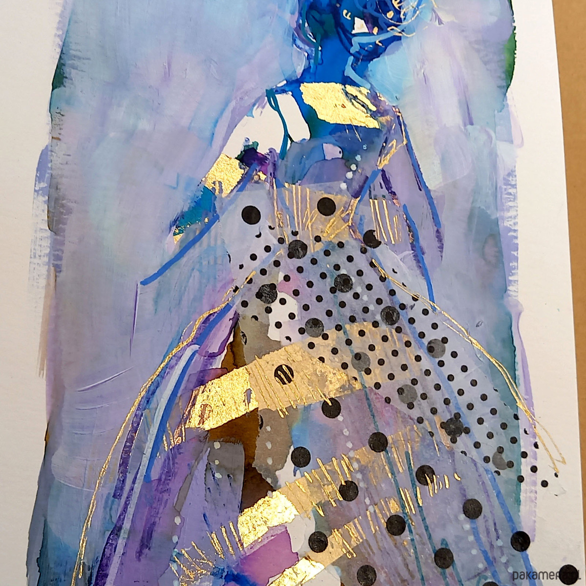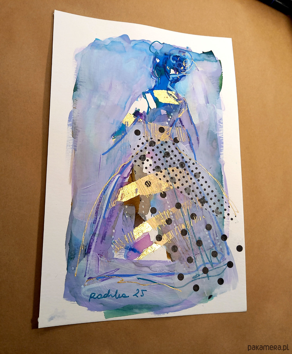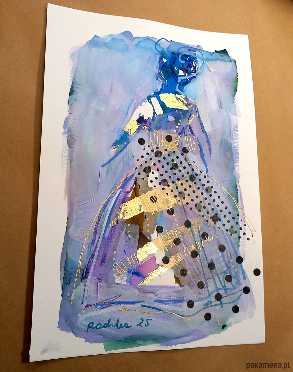 Akwarela formatu 16x24 cm wykonana za pomocą akwareli Talensa, złotych płatków szlagmetalu, z dodatkiem tuszu, akryli oraz kaligraficznych pisaków na profesjonalnym papierze akwarelowym Talens 300 g/m2. Na koniec przykleiłam półprzezroczystą bibułkę w formie kolażu.
