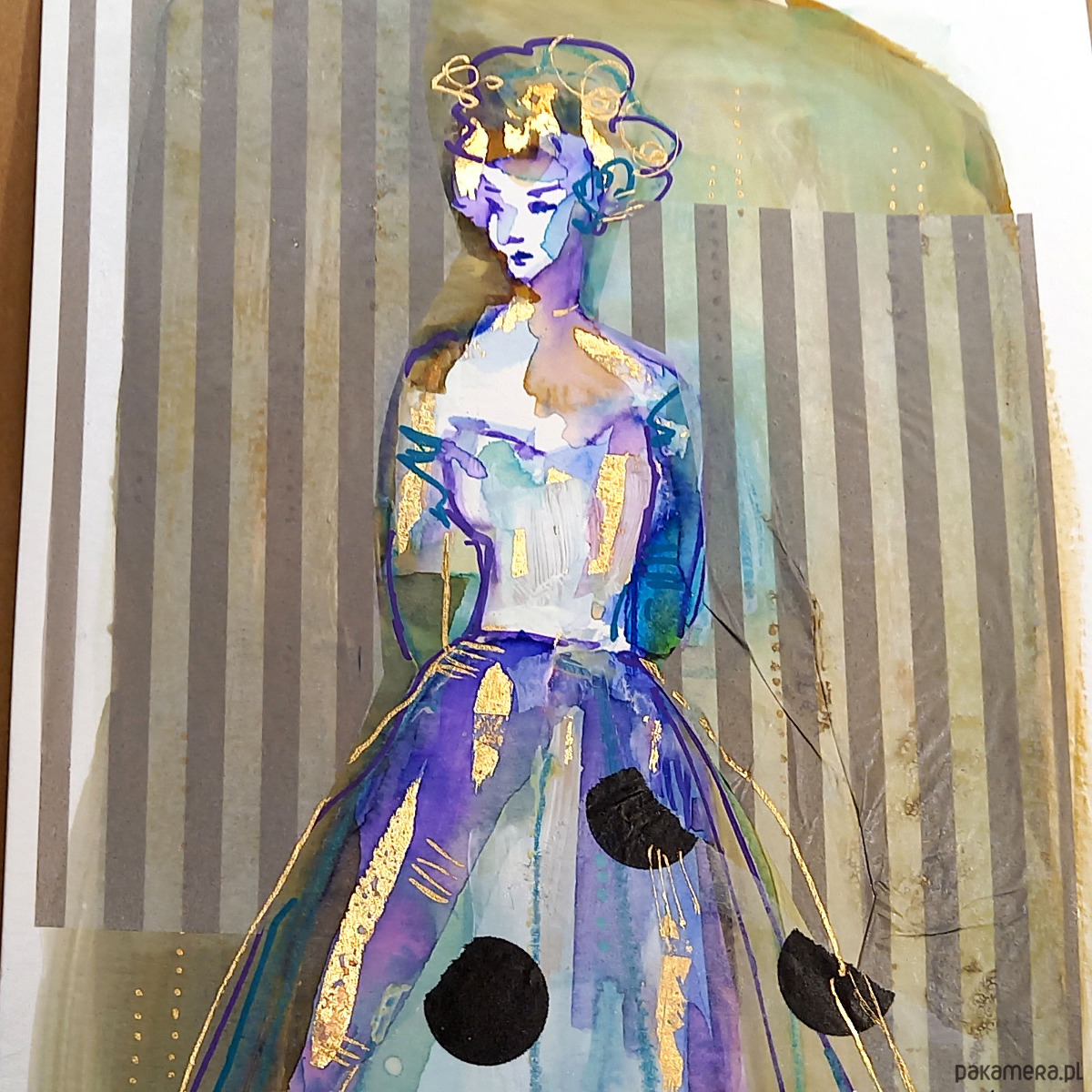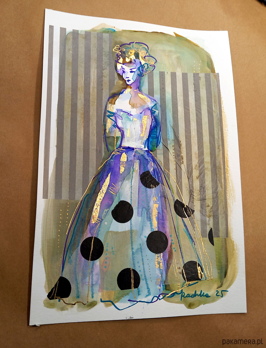 Akwarela formatu 16x24 cm wykonana za pomocą akwareli Talensa, złotych płatków szlagmetalu, z dodatkiem tuszu, akryli oraz kaligraficznych pisaków na profesjonalnym papierze akwarelowym Talens 300 g/m2. Na koniec przykleiłam półprzezroczystą bibułkę w formie kolażu.