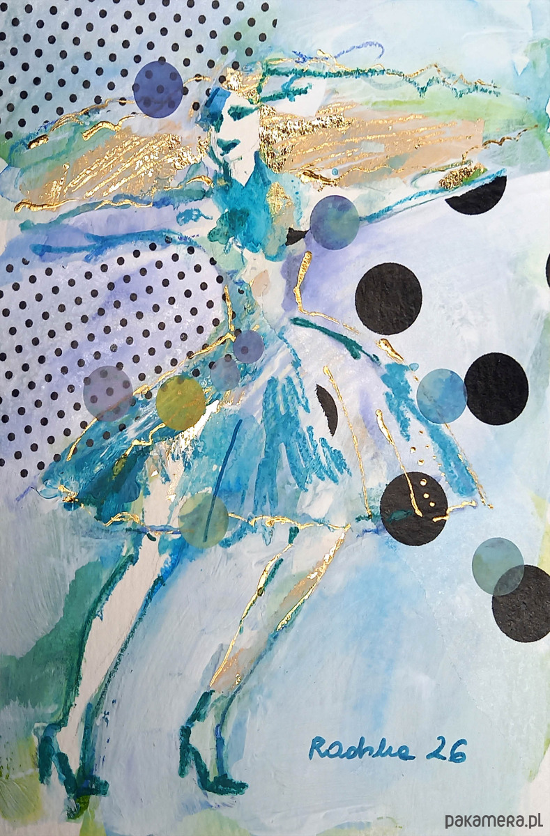 Akwarela formatu 14,8 x 19,4 cm wykonana za pomocą akwareli Talensa, złotych płatków szlagmetalu, półprzezroczystej bibułki, z dodatkiem tuszu, akryli oraz kaligraficznych pisaków na profesjonalnym papierze akwarelowym Talens 300 g/m2.