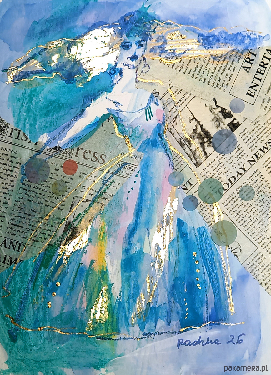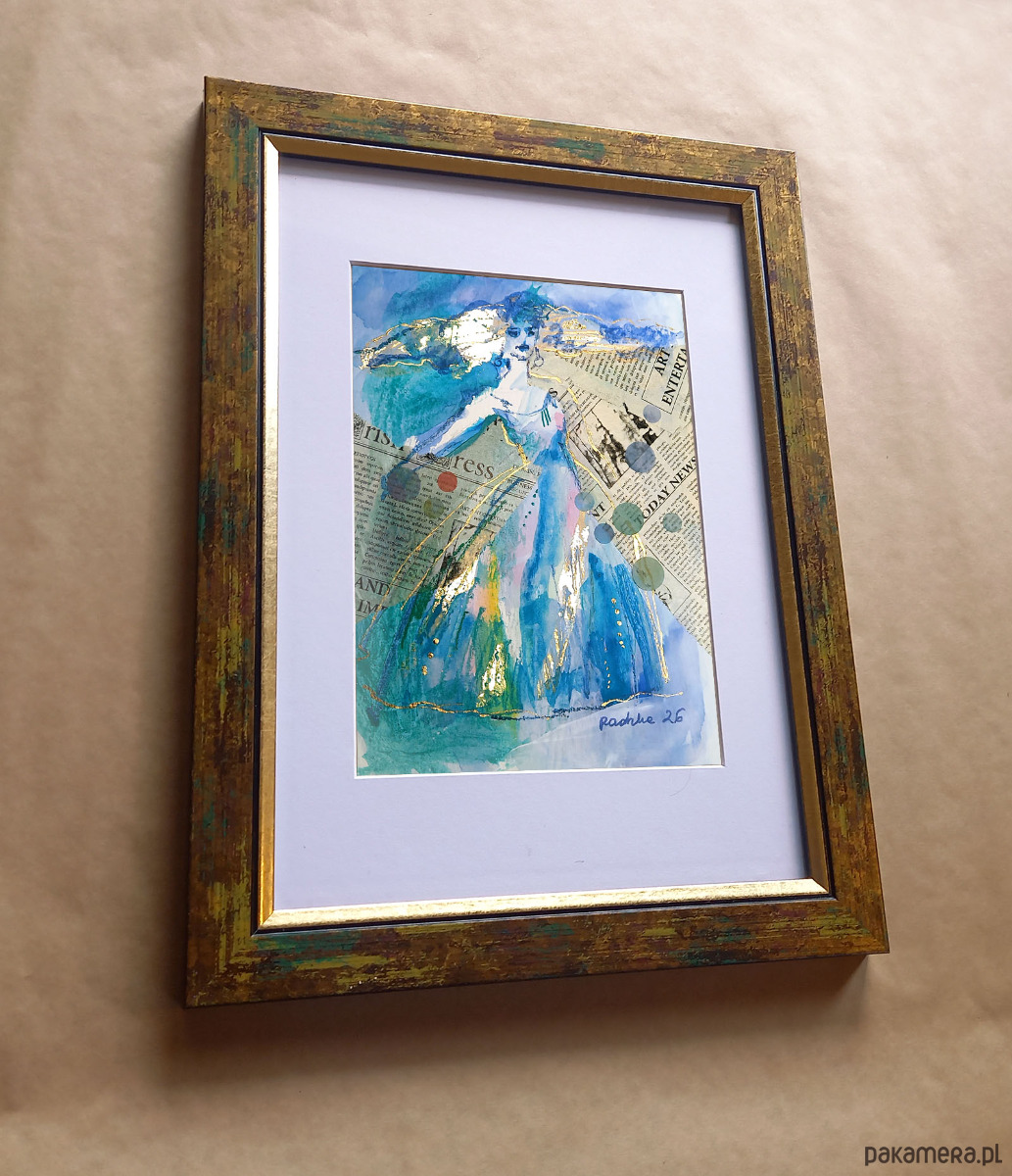 Akwarela formatu 14,8 x 19,4 cm wykonana za pomocą akwareli Talensa, złotych płatków szlagmetalu, półprzezroczystej bibułki, z dodatkiem tuszu, akryli oraz kaligraficznych pisaków na profesjonalnym papierze akwarelowym Talens 300 g/m2.
