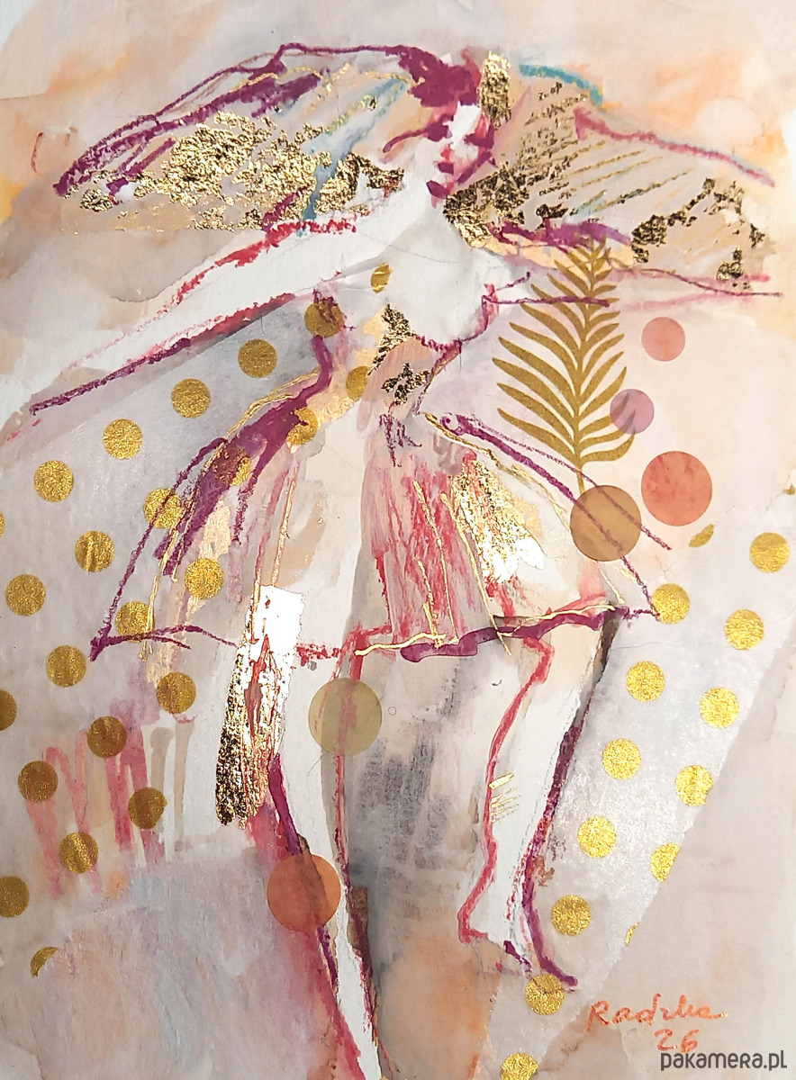 Akwarela formatu 14,8 x 19,4 cm wykonana za pomocą akwareli Talensa, złotych płatków szlagmetalu, półprzezroczystej bibułki, z dodatkiem tuszu, akryli oraz kaligraficznych pisaków na profesjonalnym papierze akwarelowym Talens 300 g/m2.