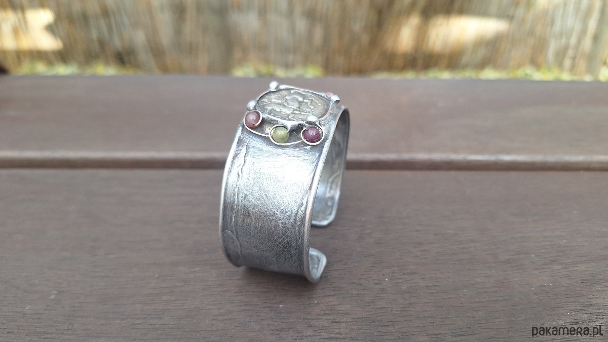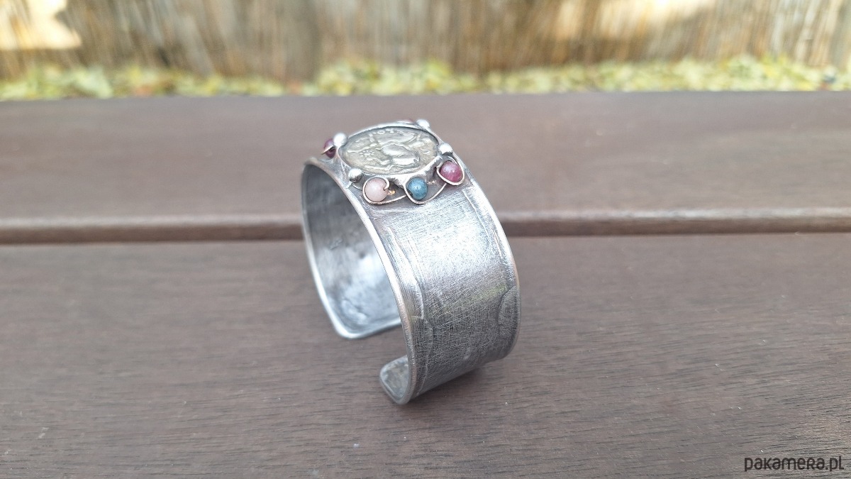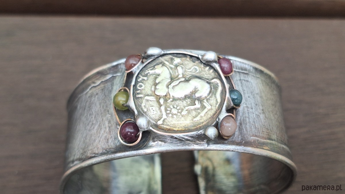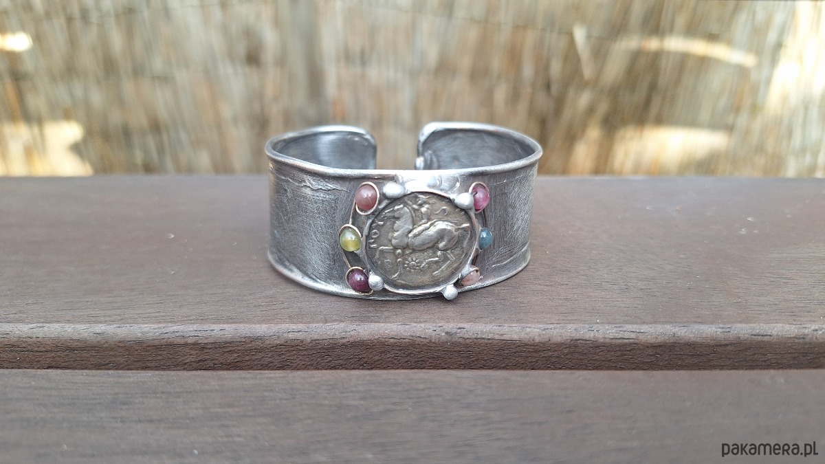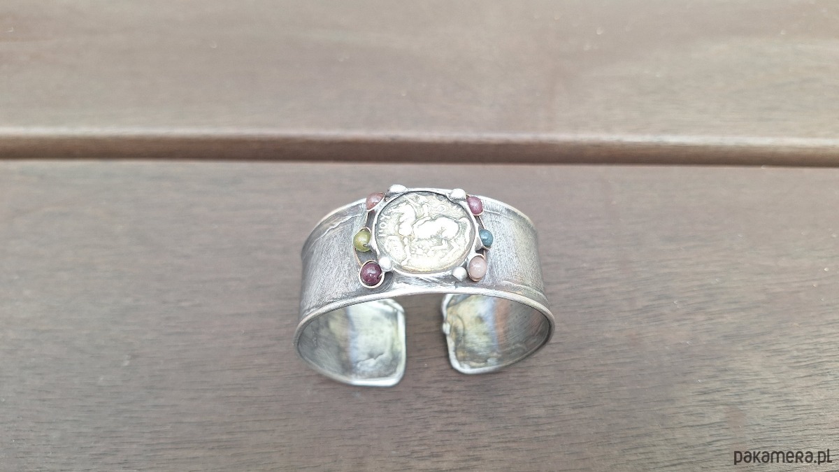 Bransoletka wykonana z miedzi, cyny i turmalinów. Szerokość 2.5 cm. Regulowana.