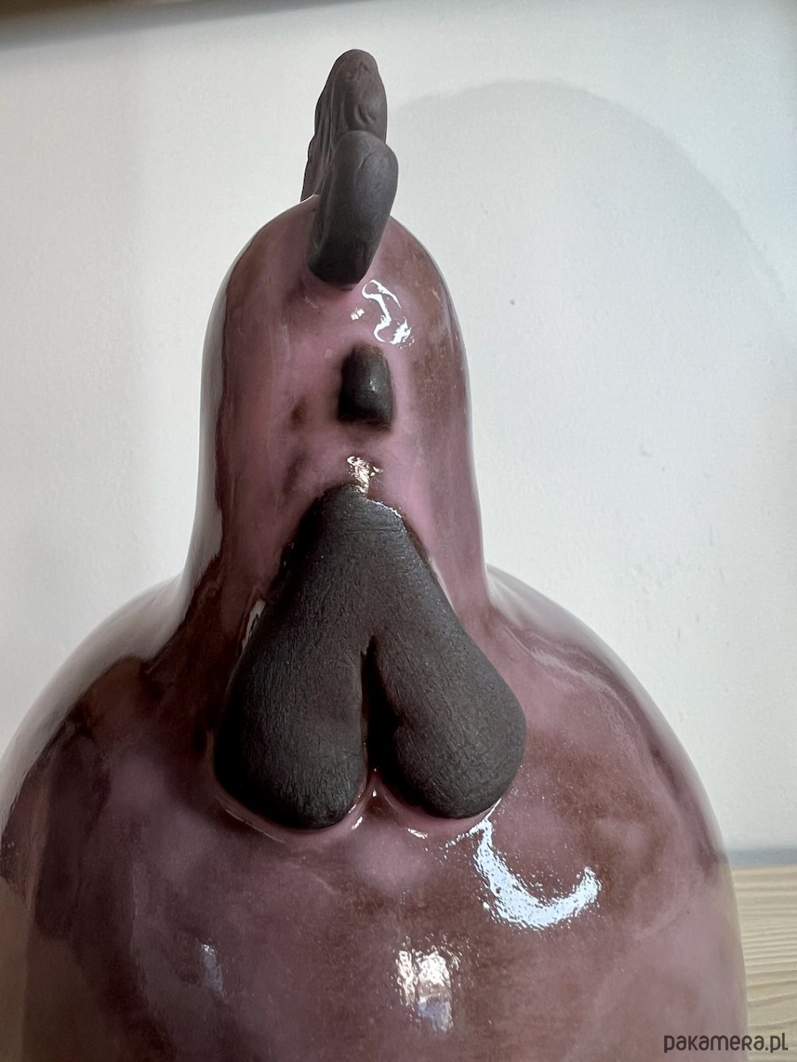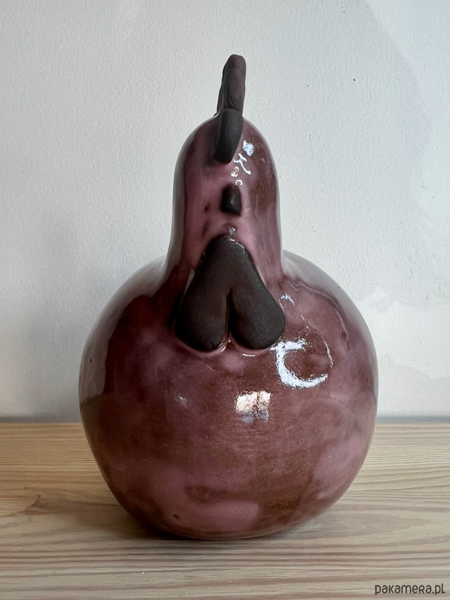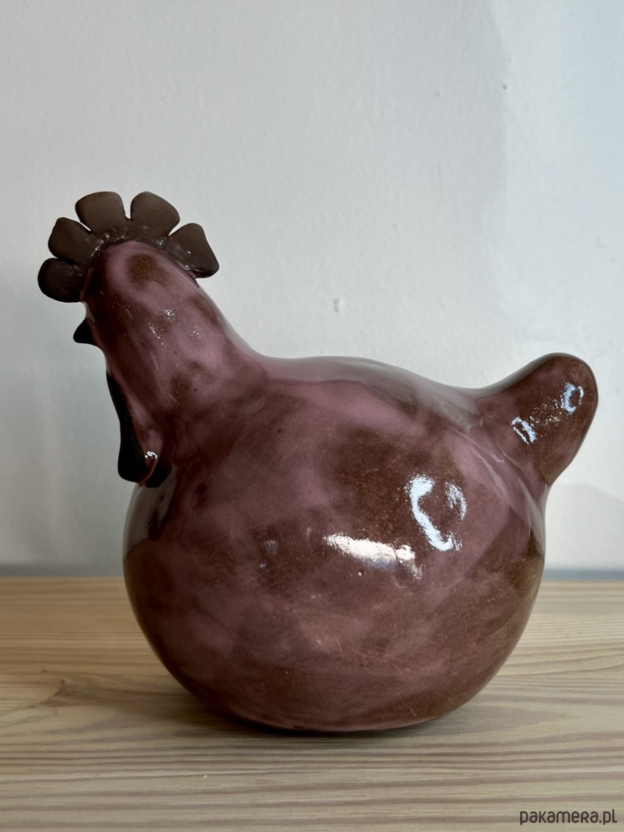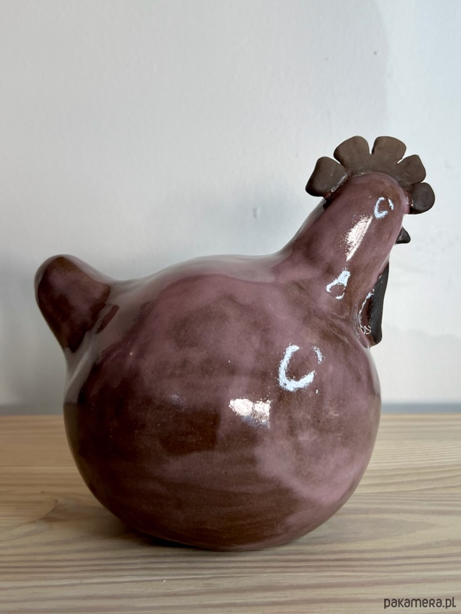 Kura ulepiona ręcznie z brązowej gliny, pokryta różowym transparentnym szkliwem.