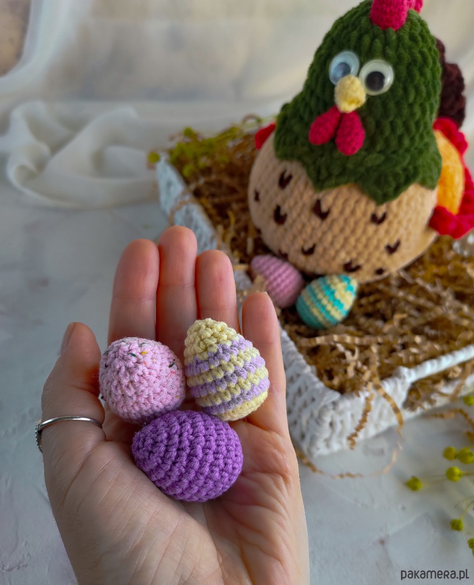 - Jajka dziergane są z pół bawełnianej włóczki (55 % bawełna, 45 % akryl)
