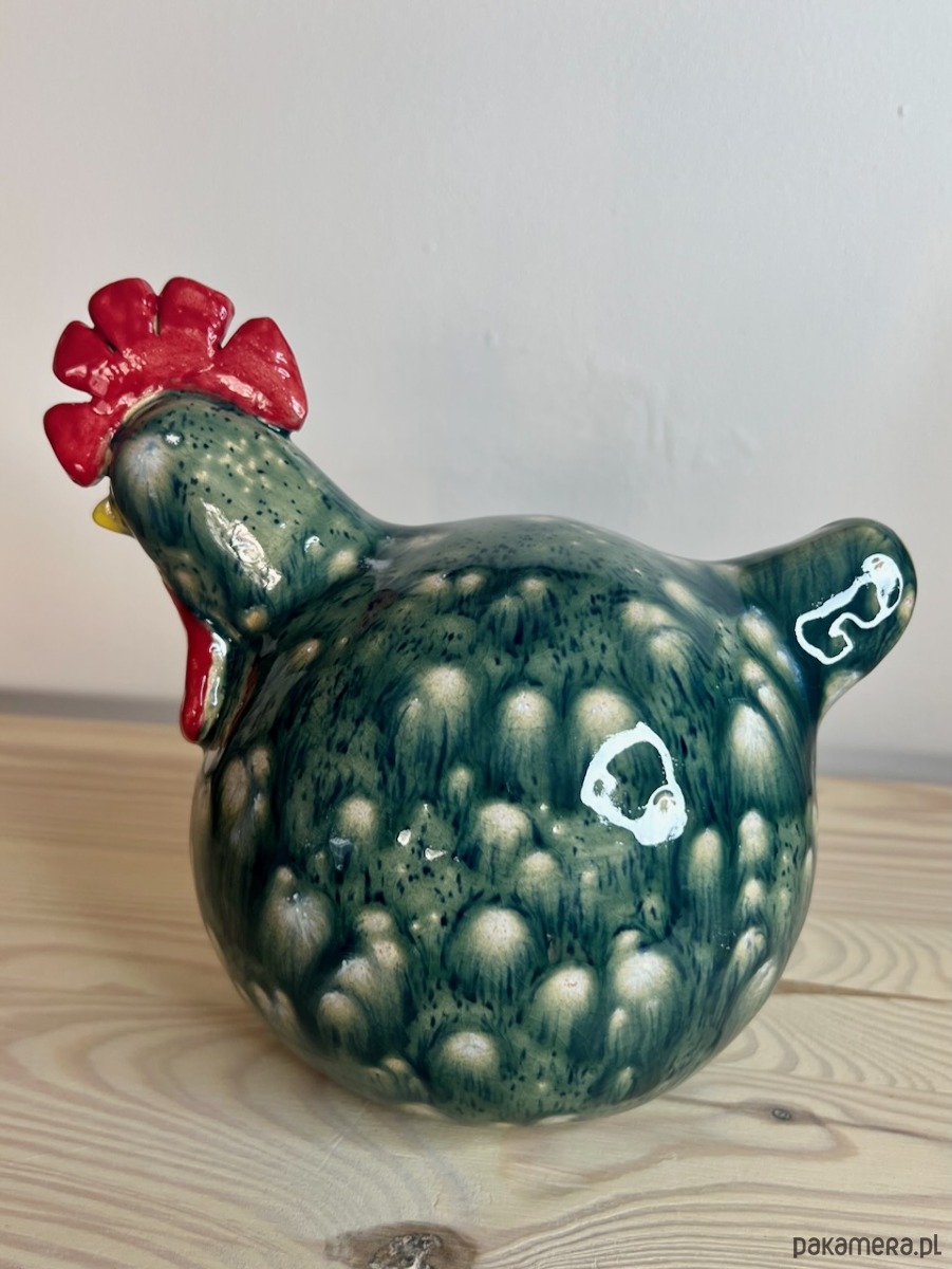 Kura ulepiona ręcznie z jasnej gliny, pokryta efektowym szkliwem krystalicznym w kolorze szmaragdowym z beżowymi plamkami.
