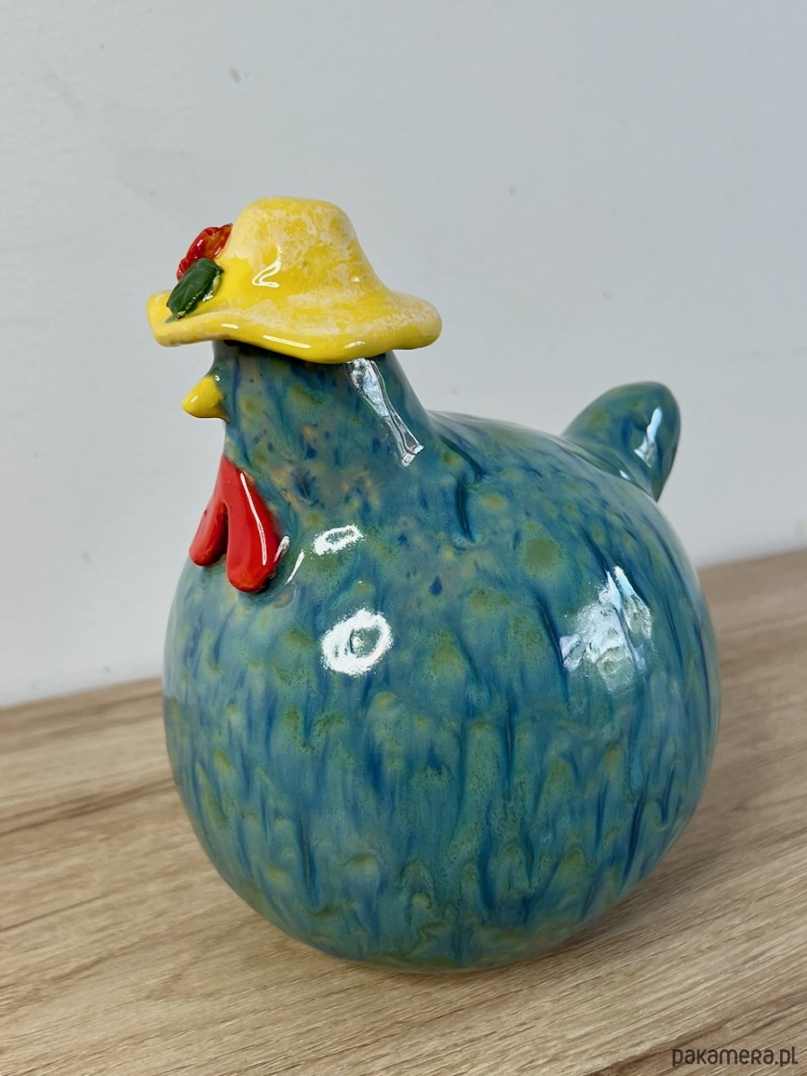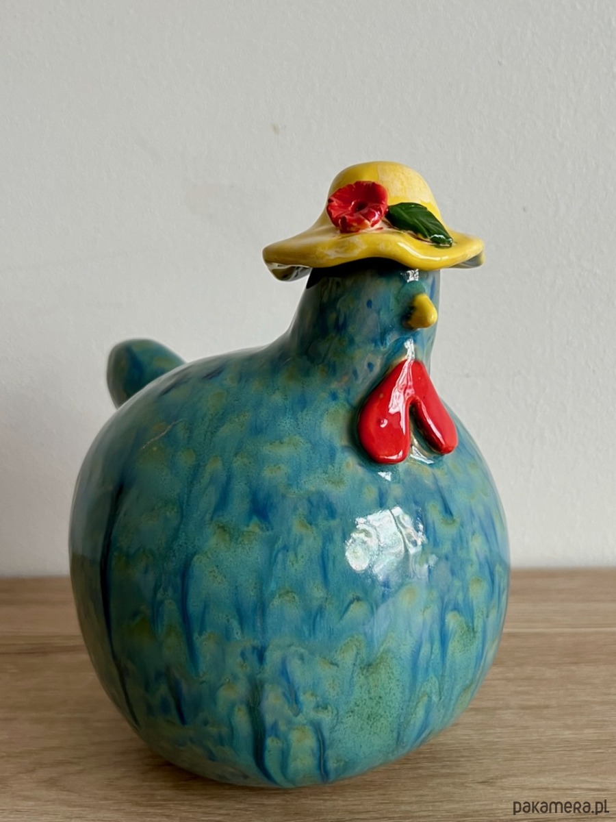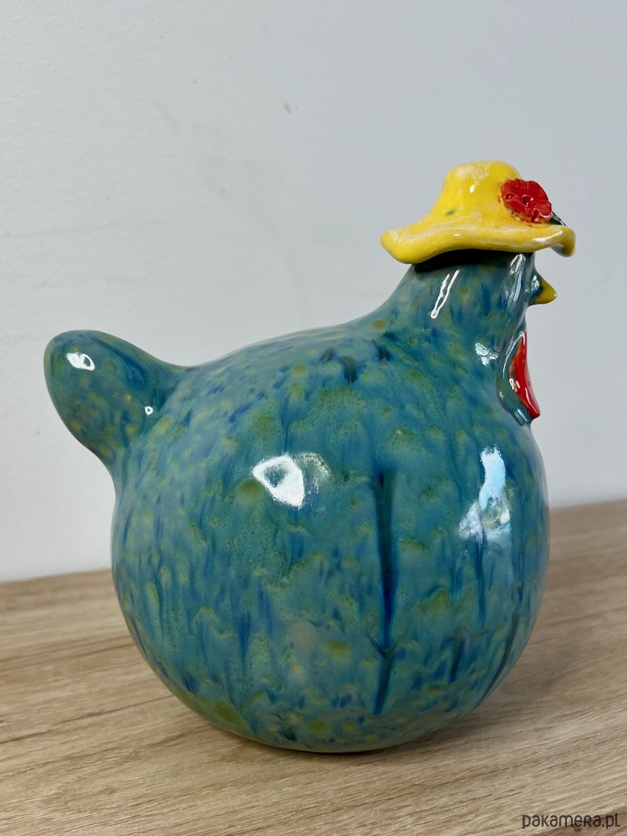 Kura ulepiona ręcznie z jasnej gliny, pokryta turkusowym efektowym szkliwem.