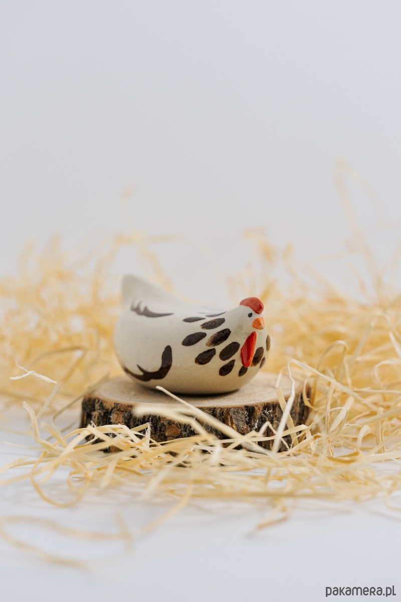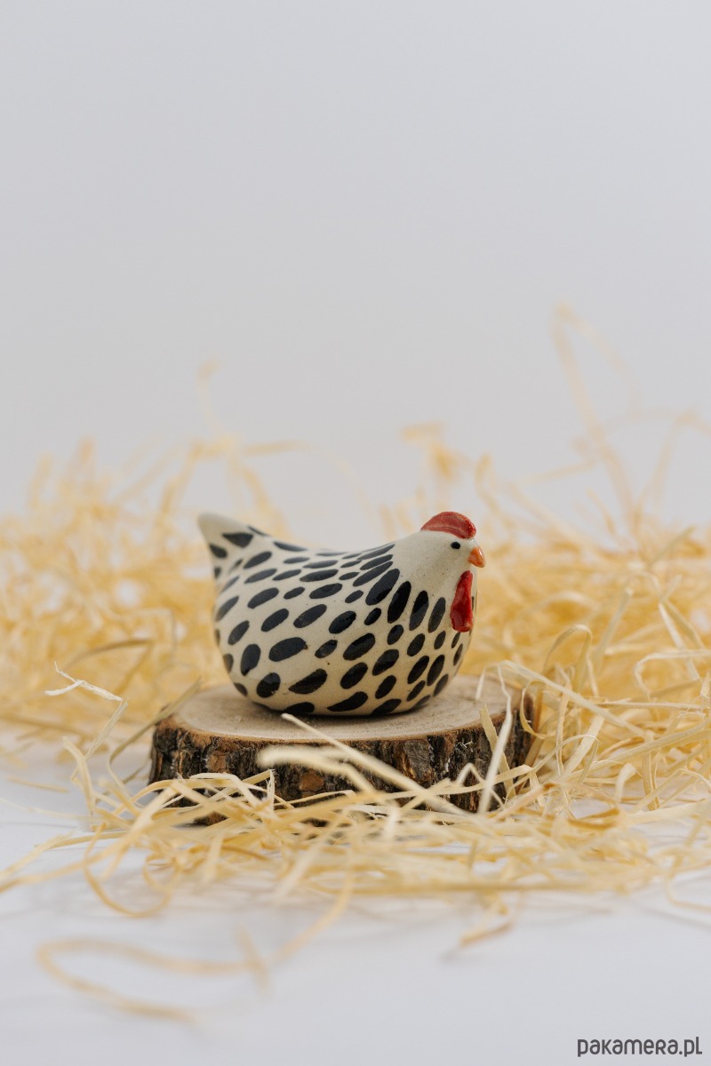 Ceramiczna kurka dekoracyjna o minimalistycznej formie zdobiona brązowymi plamkami.