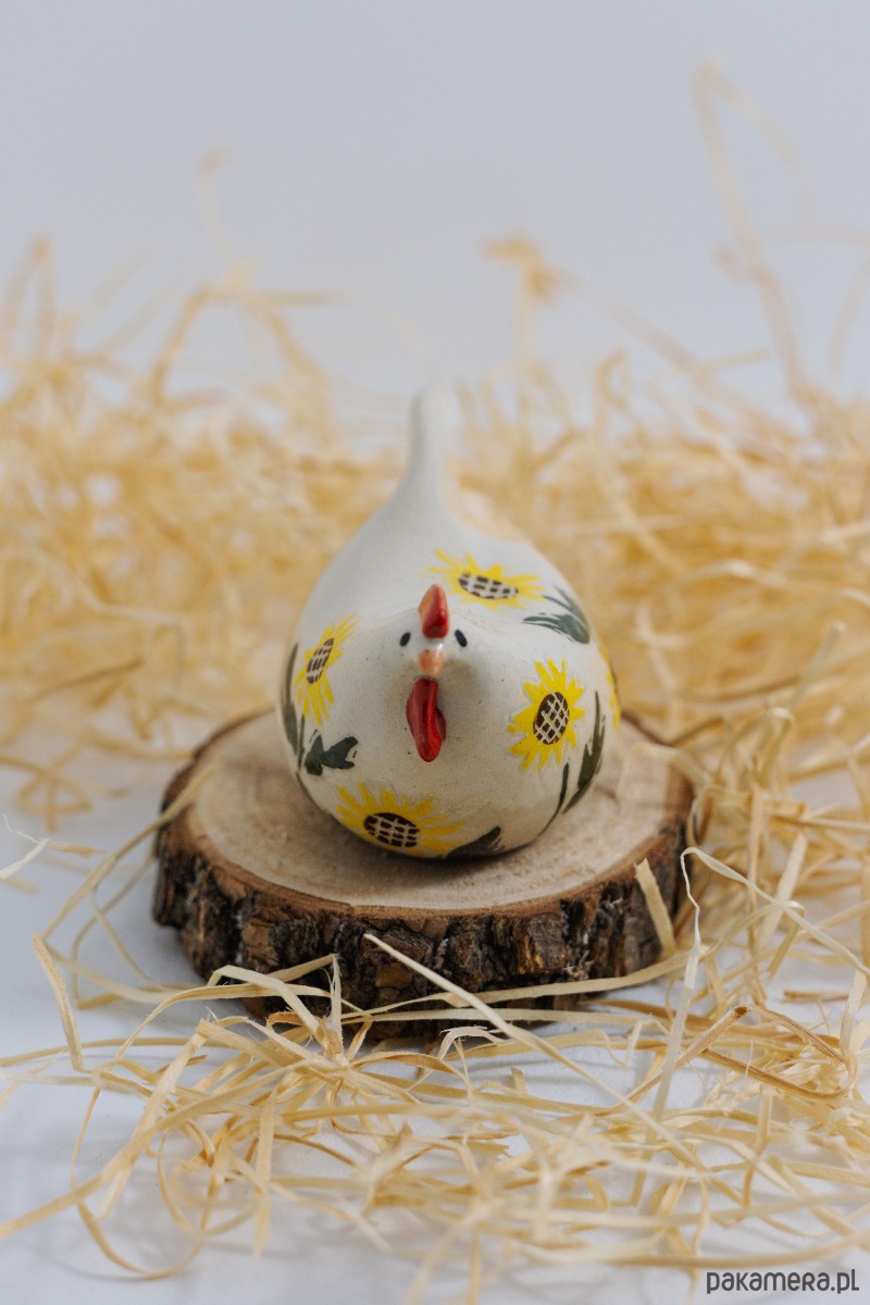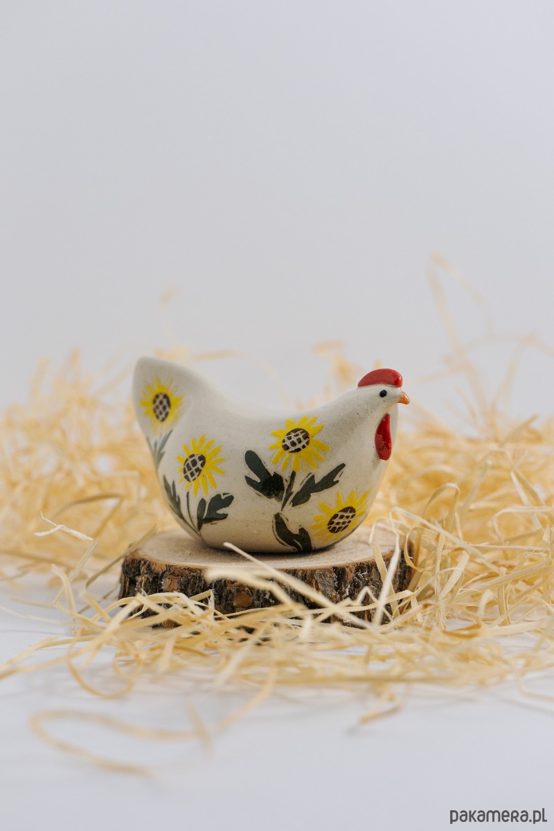Ceramiczna kurka dekoracyjna o minimalistycznej formie z malowanymi słonecznikami.