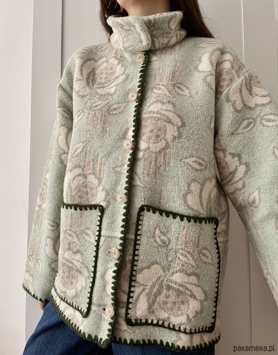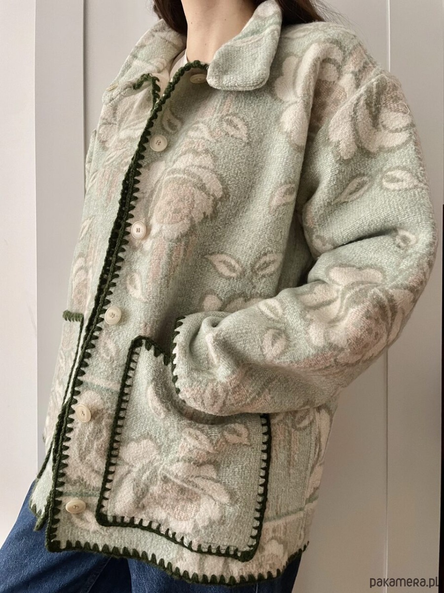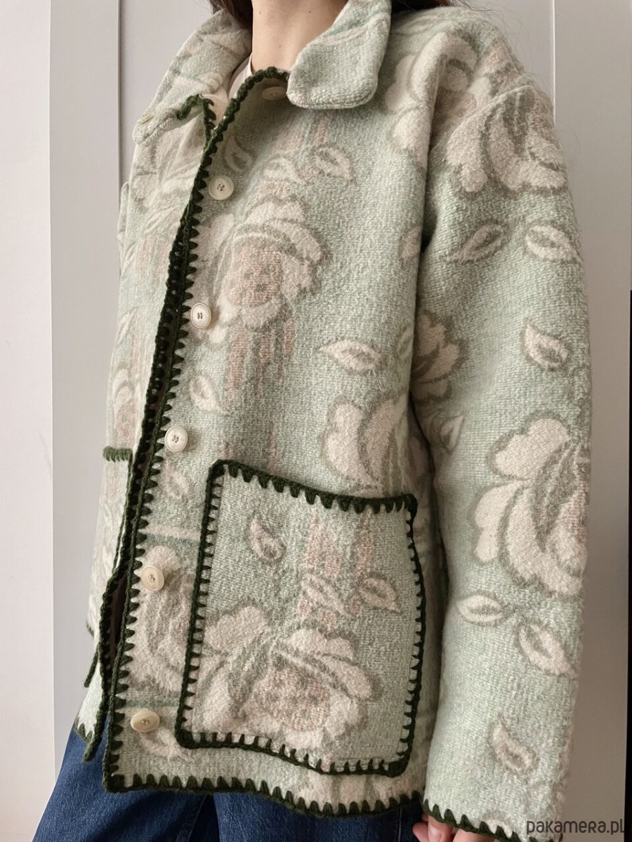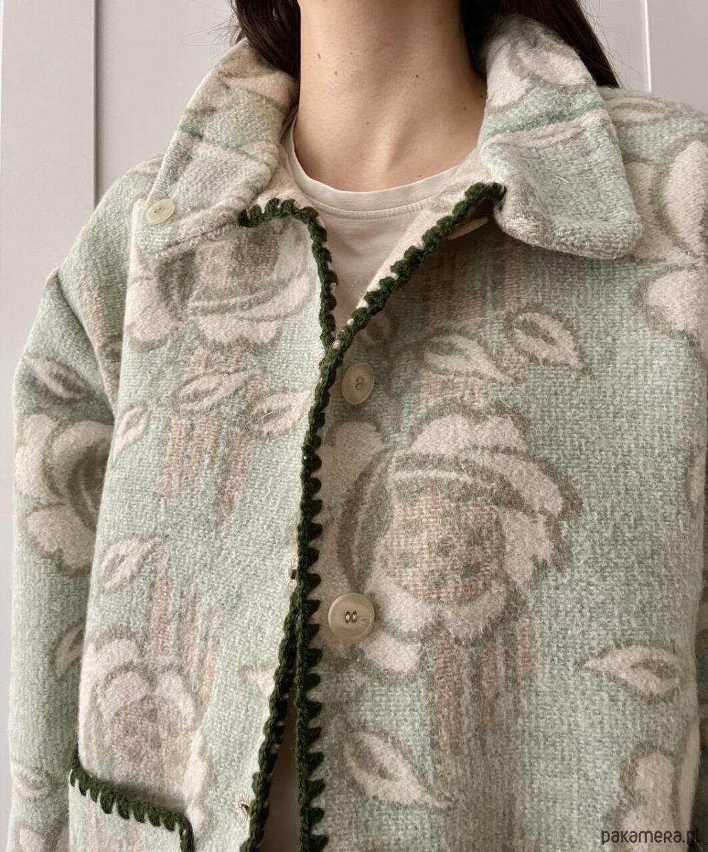 Pastelowa kurtka uszyta ręcznie z wełnianego koca z drugiego obiegu.