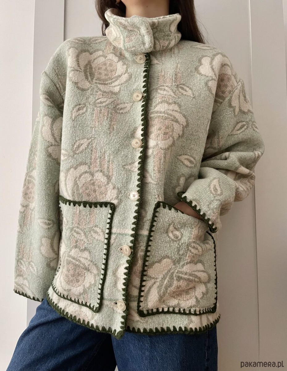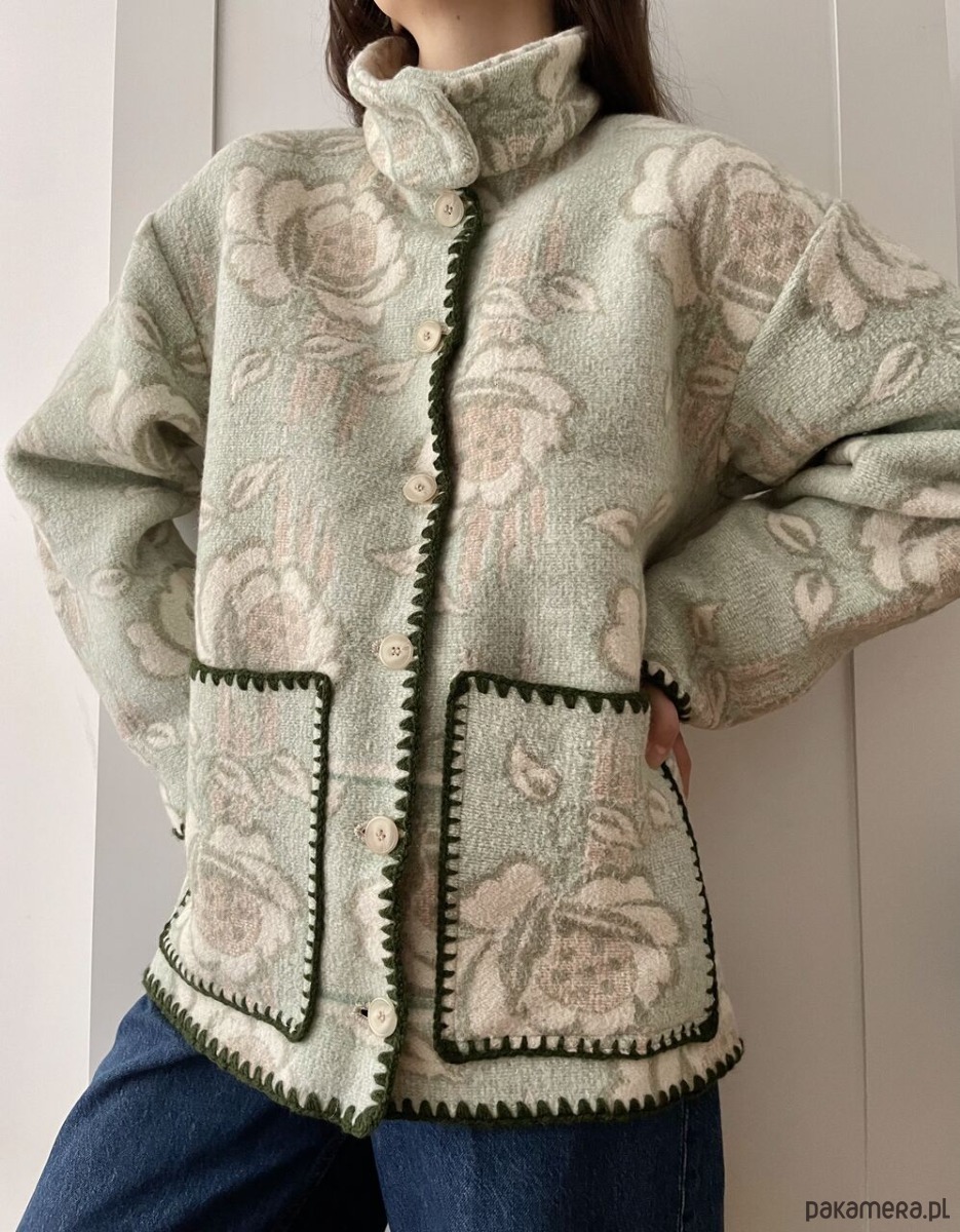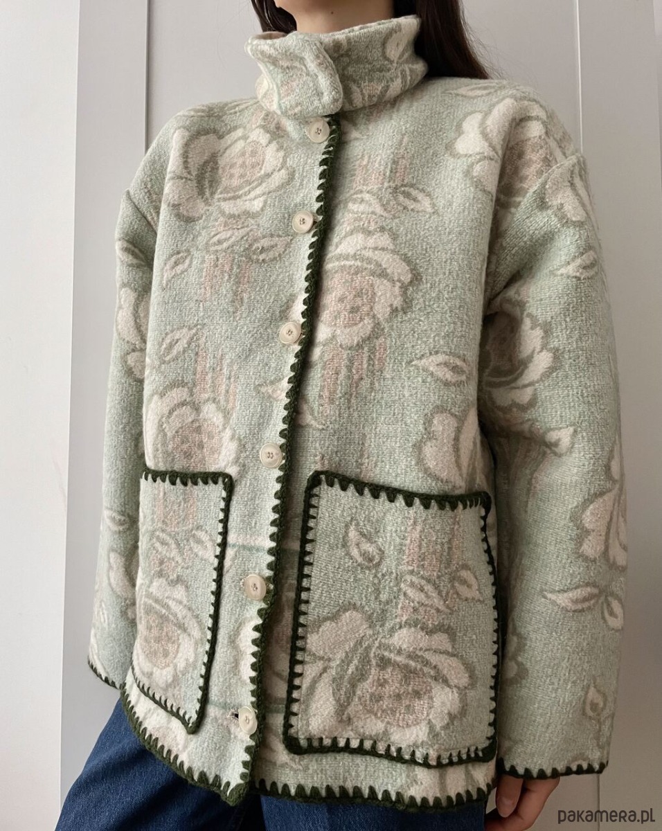Pastelowa kurtka uszyta ręcznie z wełnianego koca z drugiego obiegu.