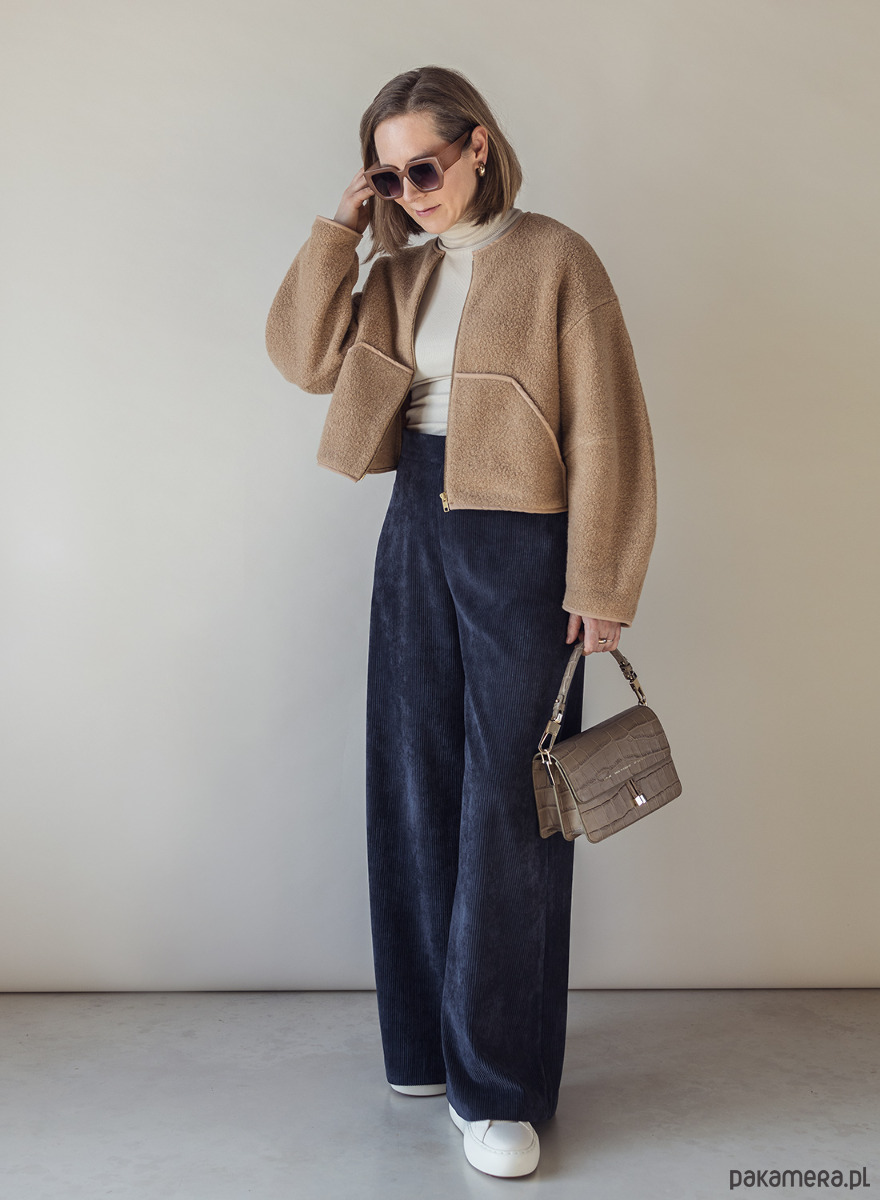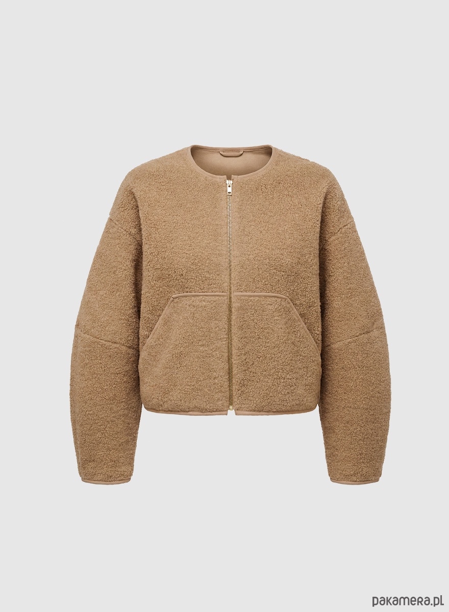 Krótka, wełniana kurtka zapinana na zamek z powłoką antyniklową (zapobiega uczuleniom). Dół, rękawy i dekolt wykończone lamówką. Dwie kieszenie z przodu.