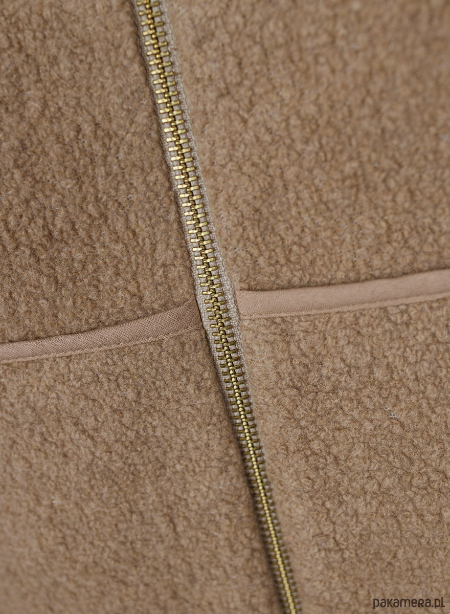 Krótka, wełniana kurtka zapinana na zamek z powłoką antyniklową (zapobiega uczuleniom). Dół, rękawy i dekolt wykończone lamówką. Dwie kieszenie z przodu.