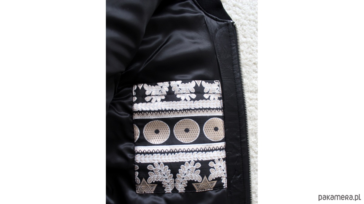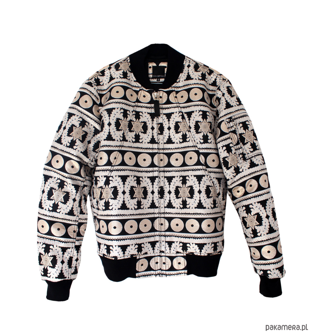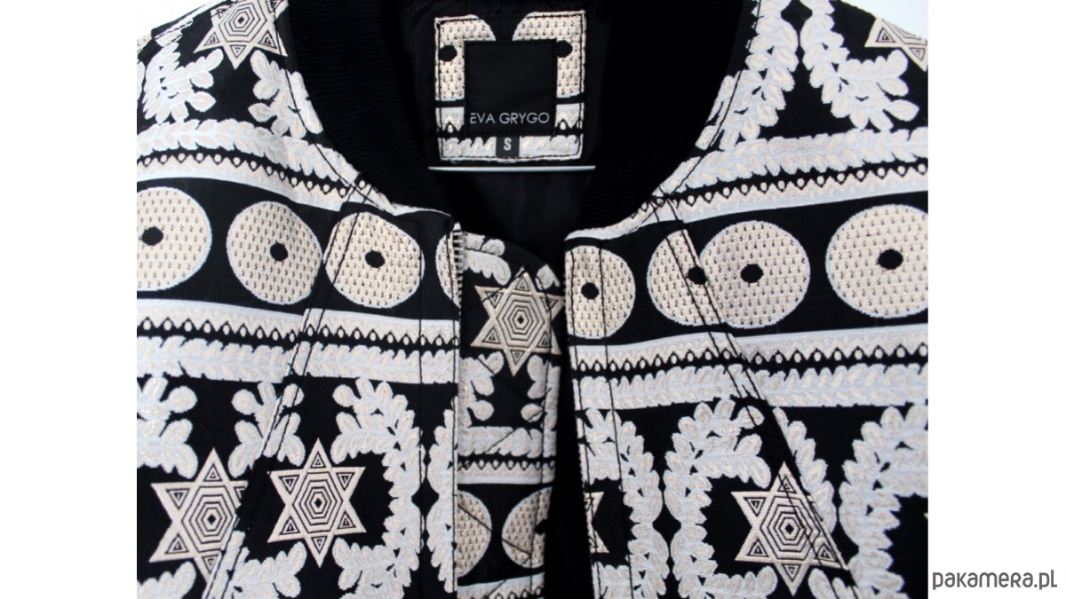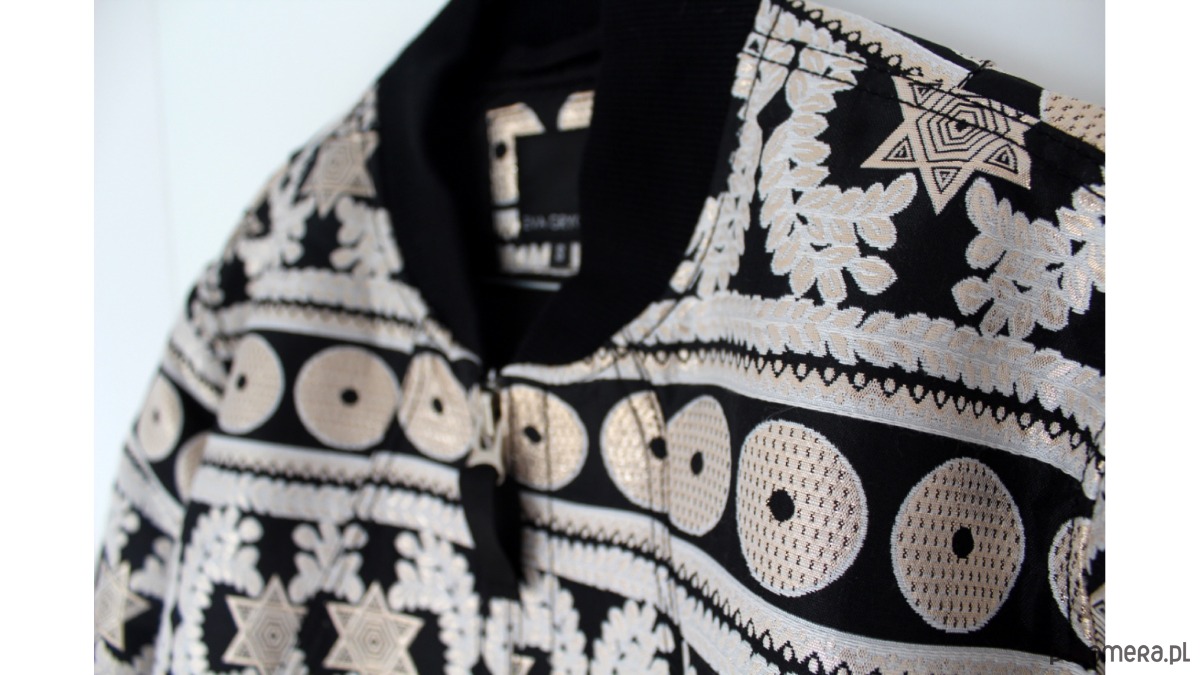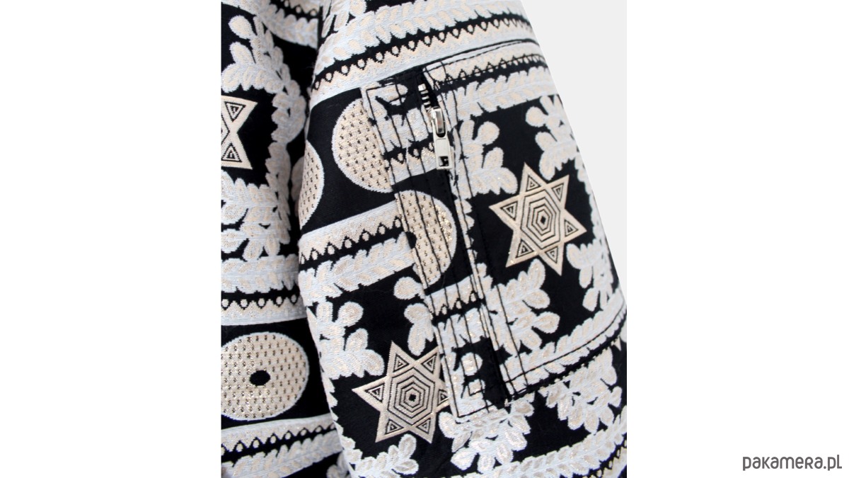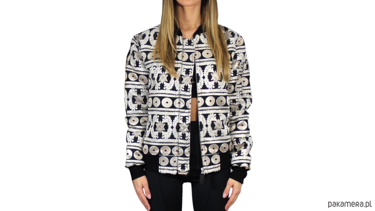 Nowoczesna kurtka typu bomber w lekkim, oversize’owym kroju. Wykonana z czarno-białego materiału żakardowego z subtelnym połyskiem złotych i srebrnych, metalicznych nici, tworzących oryginalny geometryczny wzór. Zapinana na metalowy zamek, wykończona czarnymi ściągaczami przy rękawach i kołnierzyku.