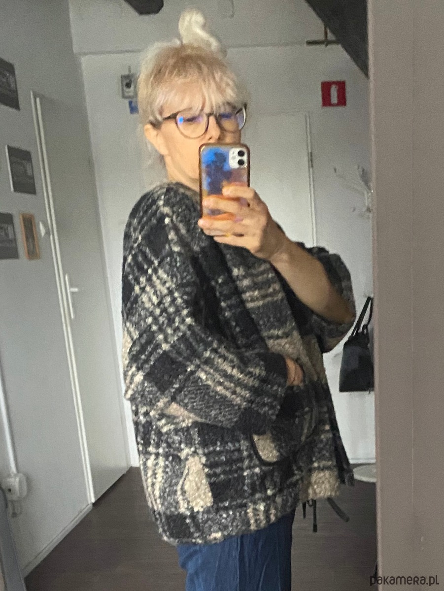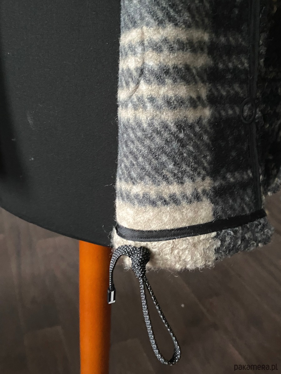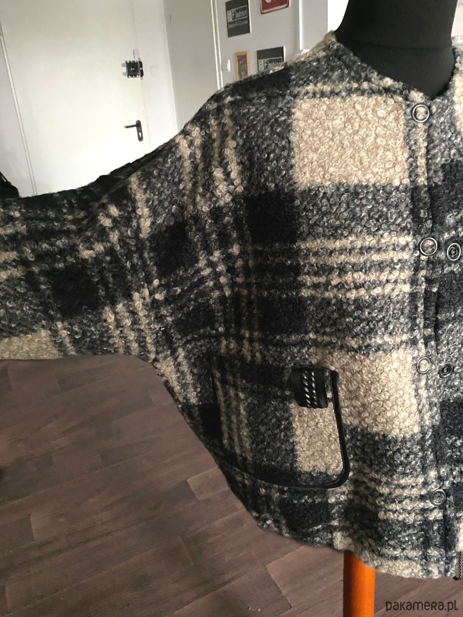 Kurtka Gaja to kurtka z dzianiny typu bucle. Dzianina jest miękka i mięsista, wzór w dużą kratę. Forma kurtki to uniwersalny kształt pudełka - oversize. Na plecach jest kontrafałda. Na przodzie są kieszenie z kontrastowa lamowką. Dók jest zaończony tunelem z ozdobnym sznurkiem. Kurtka jest zapinana na 4 napy - springi. Kurtka od środka wykończona lamowką. Rękaw 7/8. Dostępny jeszcze w kolorze czarnym i ecru.