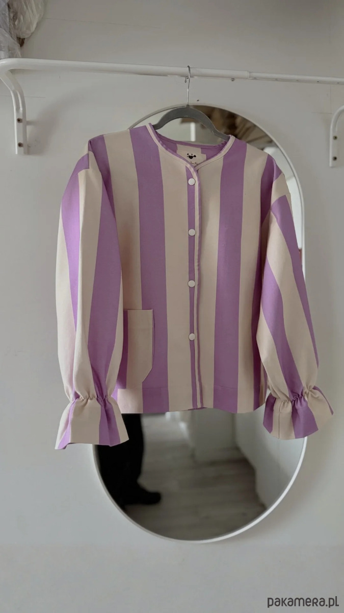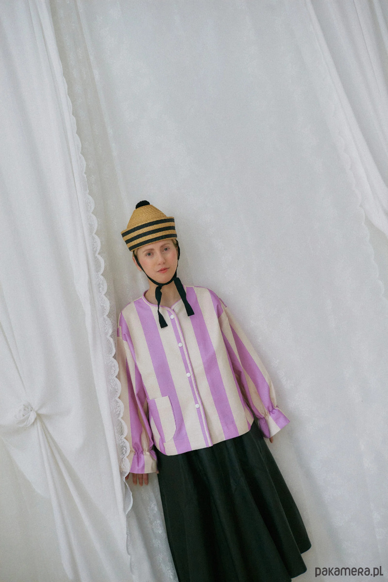 Kurtka o pudełkowej konstrukcji uszyta z jakościowej tkaniny ze skośnym splotem typu Panama. Kurtka posiada wzór w szerokie pasy, który naniesiony został na tkaninę za pomocą trwałych, japońskich atramentów wodnych.