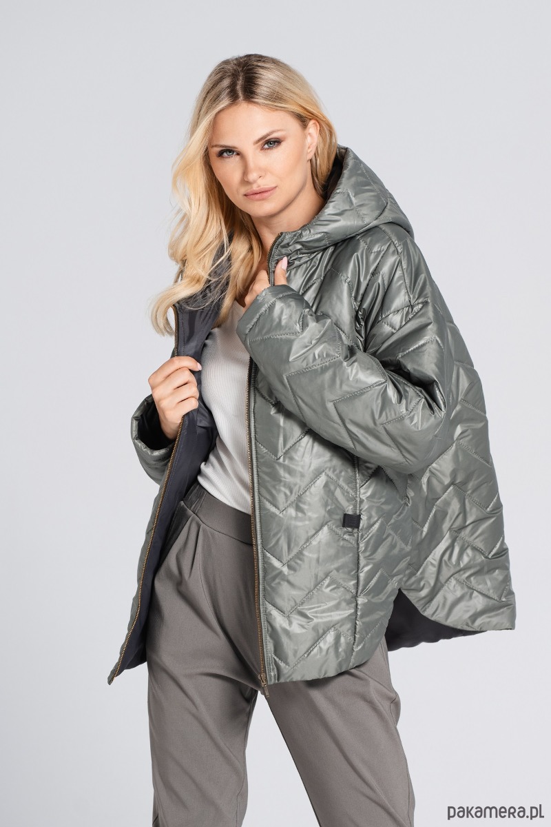 Krótka oversizeowa kurtka pikowana, wygodna , pudełkowa forma, zapinana na zamek błyskawiczny, z obszernym kapturem. Kurtka jest wypełniona ciepłym i miękkim puchem syntetycznym, o gramaturze 180gsm, posiadającym wysokie właściwości termiczne, antyalergiczne, oraz bardzo wysoką tolerancję na wilgoć. Wypełnienie zostało wypikowane wraz z podszewką , przez co daje gwarancję stabilności podczas użytkowania. Technologia pikowania ultradźwiękiem dodatkowo zapewnia komfort, jest przez to bardziej wiatroszczelna i wodoodporna