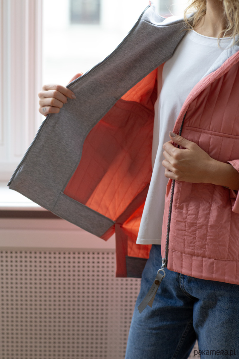 Kurtka HOOBEE - wersja pikowana, już letnia. Bardzo cienka pikówka, idealnie sprawdzi się na ciepłą wiosnę i letnie wieczory. W środku wykończyliśmy tą wersje szarą lamówką. Obłożenie wykonane jest z dzianiny dresowej kolorze szarego melanżu. Ta wersja nie posiada podszewki.