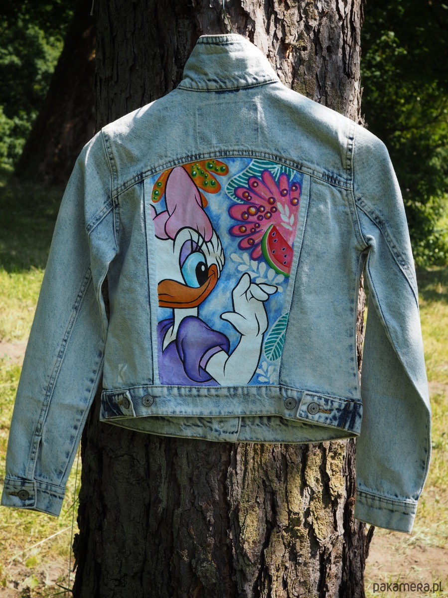 Ręcznie malowana jeansowa kurtka damska, inspirowana kreskówką Walta Disneya. Odpowiednia dla drobnej osoby dorosłej lub dużej dziewczynki.