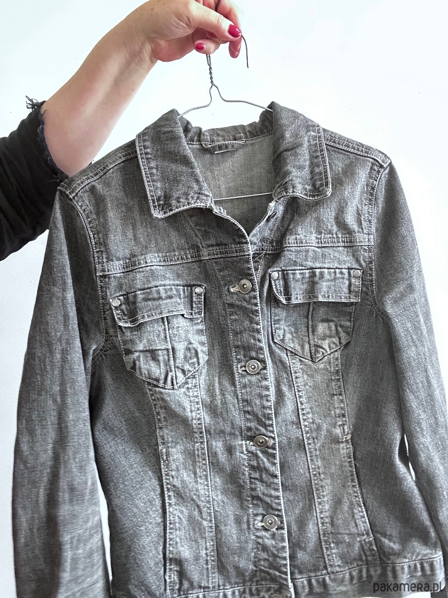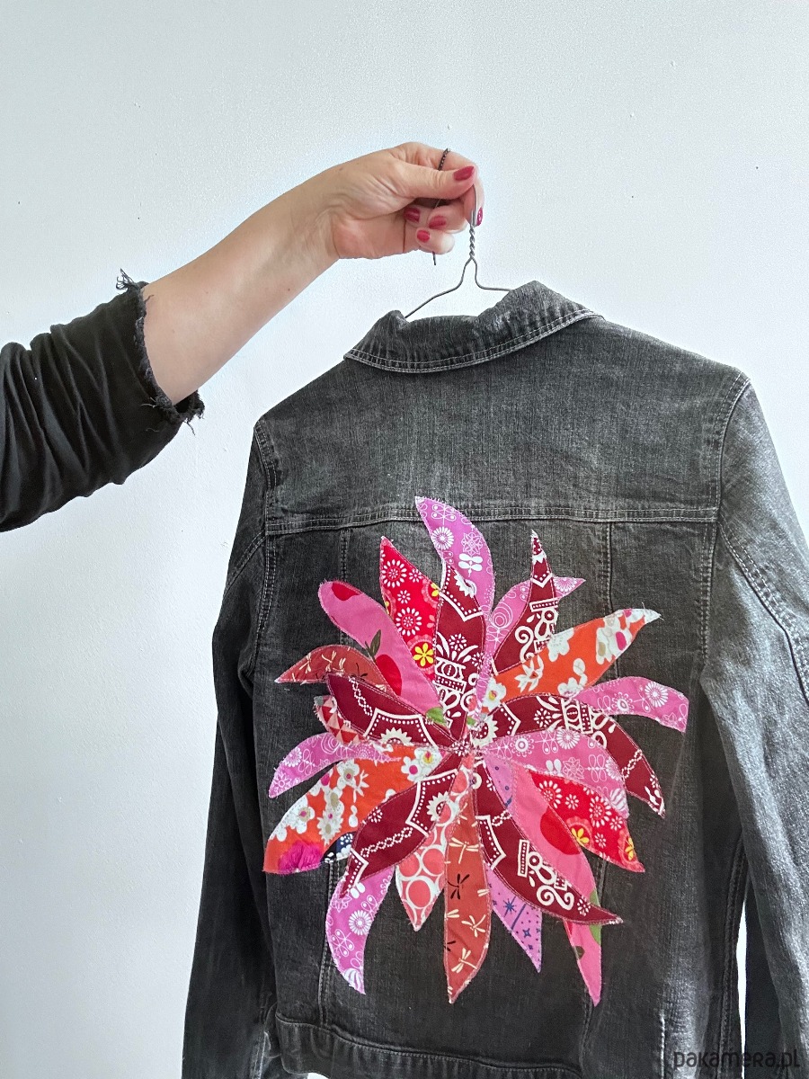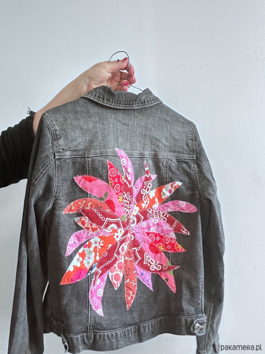 Nowoczesna kurtka jeansowa wykonana w duchu upcyklingu. Wykonana na plecach kurtki aplikacja z tkanin tworzy nowy look i oryginalną metamorfozę jeansowej kurtki. Aplikacja naszywana z tzw. surowym brzegiem ulega nieznacznemu wystrzępieniu, co nadaje kurtce dość artystycznej formy. Aplikacja jest zabezpieczona, tak więc efekt strzępienia nie będzie się pogłębiał.