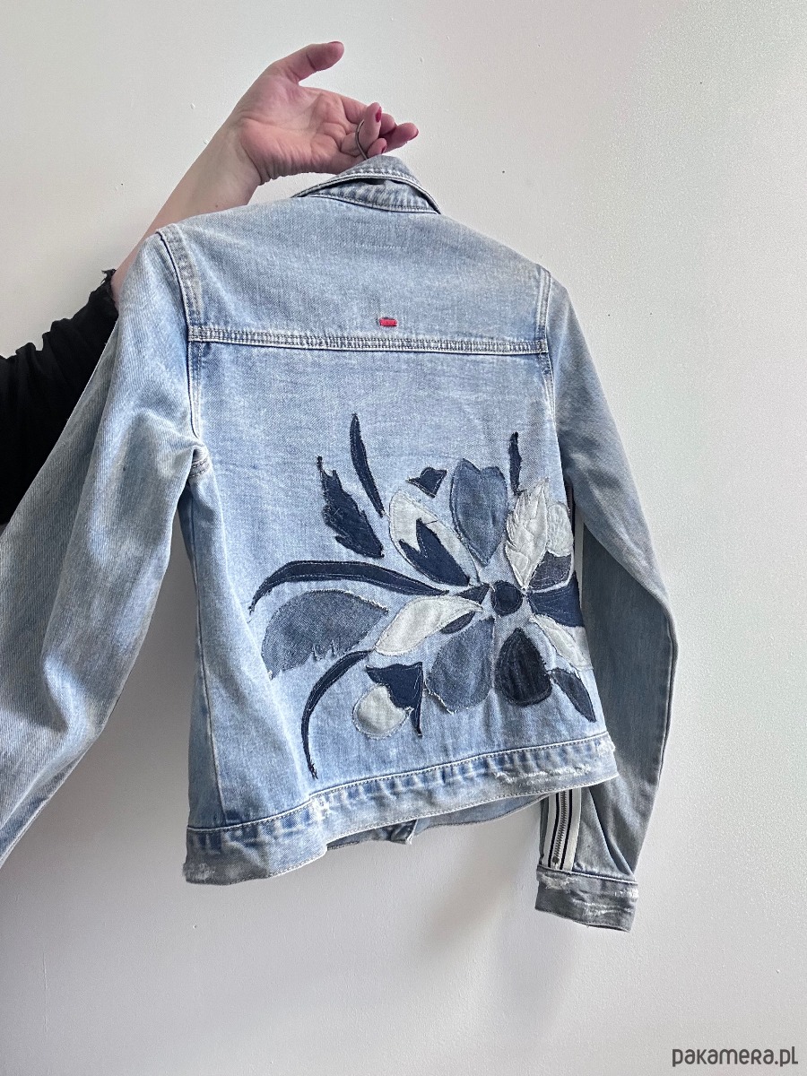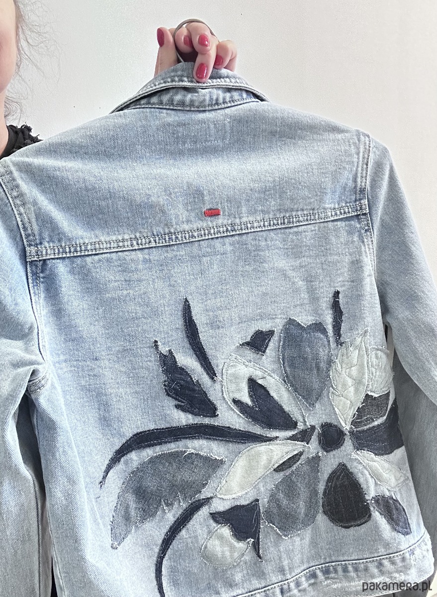 Nowoczesna kurtka jeansowa wykonana w duchu upcyklingu. Wykonana na plecach kurtki aplikacja z jeansu tworzy nowy look i oryginalną metamorfozę jeansowej kurtki. Aplikacja naszywana z tzw. surowym brzegiem ulega nieznacznemu wystrzępieniu, co nadaje kurtce dość artystycznej formy. Aplikacja jest zabezpieczona, tak więc efekt strzępienia nie będzie się pogłębiał. Dodatkowym elementem zdobniczym są taśmy z metalowych suwaków na rękawach.