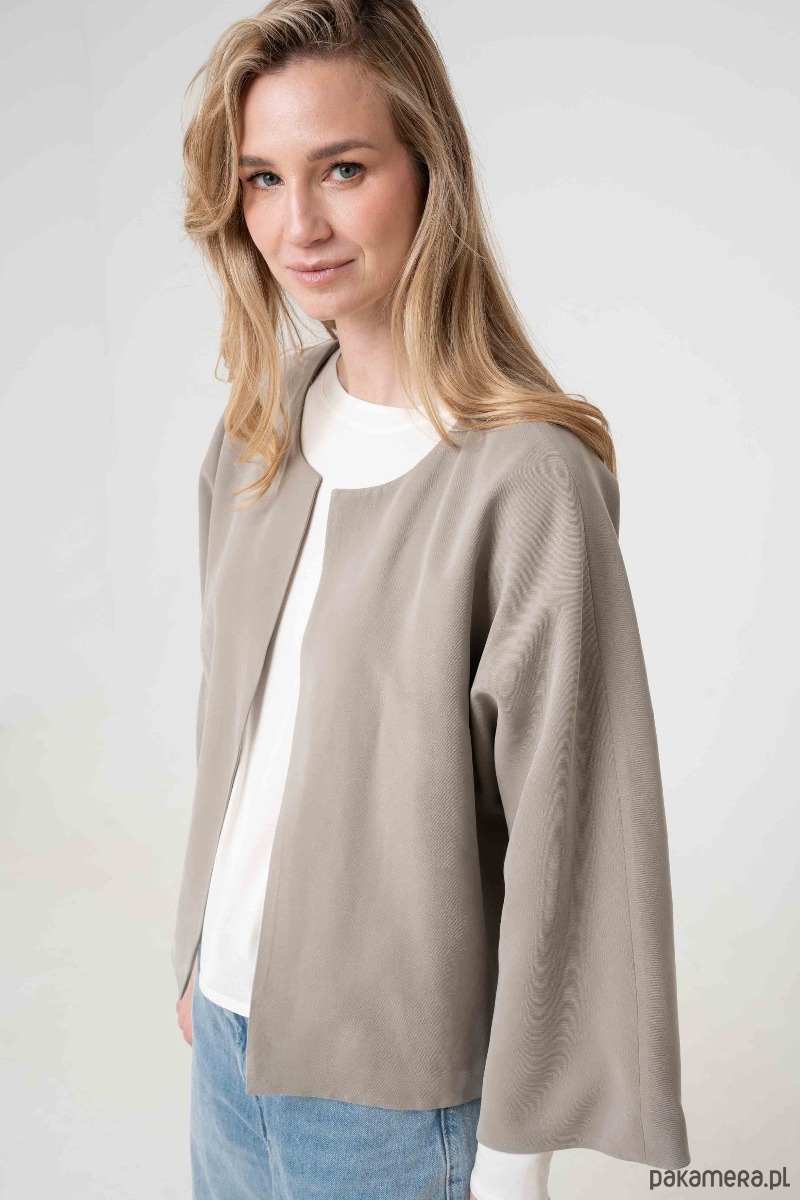 Rękawy o długości 3/4 można wywinąć, tworząc ozdobny mankiet. Kurtka została uszyta z miękkiej, lejącej się wiskozy o delikatnym połysku – tkaniny przyjemnej w dotyku, która pięknie układa się na sylwetce.