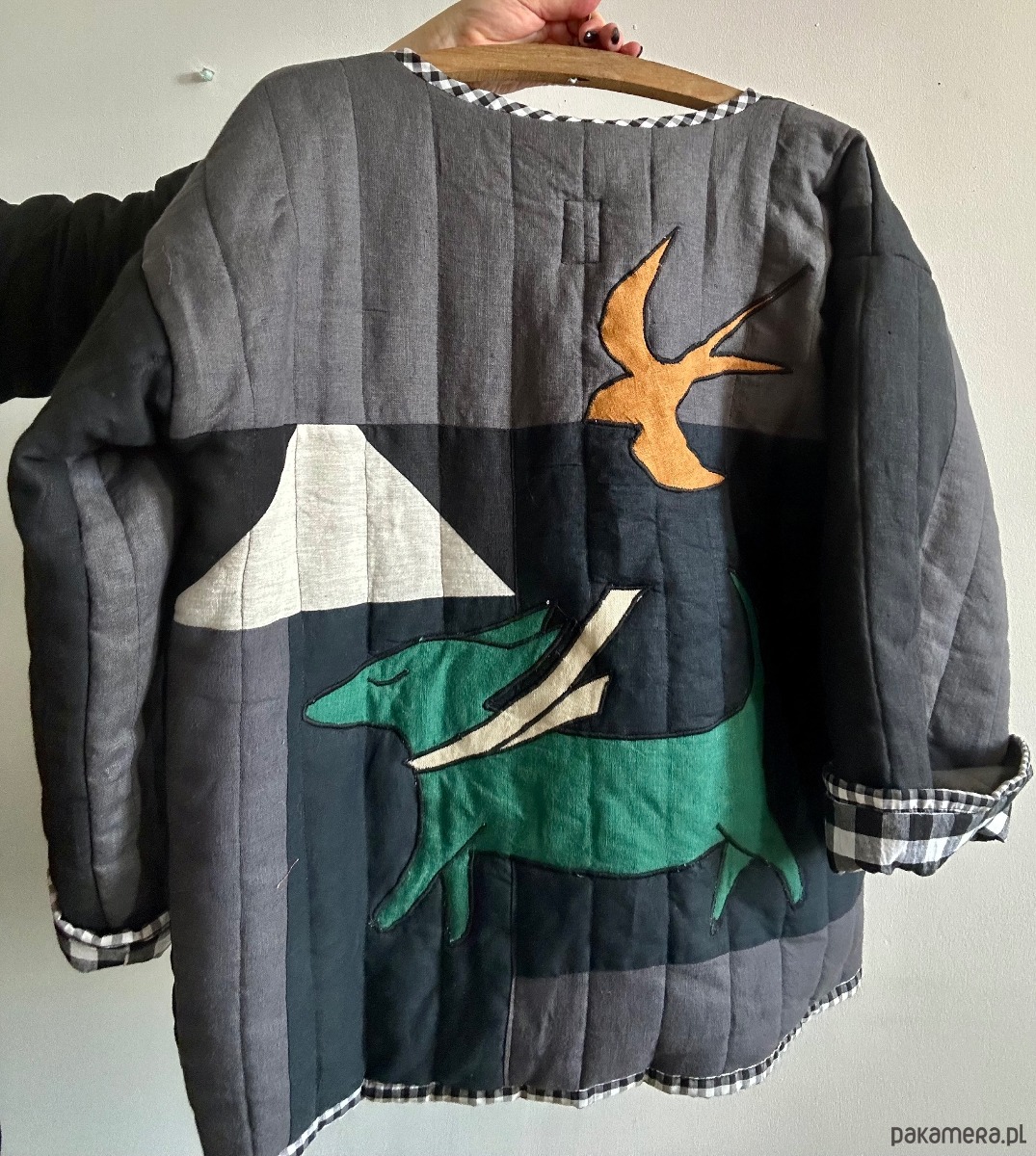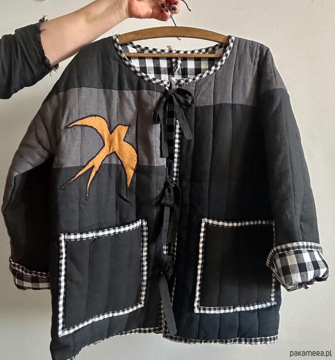 Unikatowa pikowana kurtka z czarnego lnu z aplikacjami. Wykonana z lnów produkcji europejskiej pozostałych po wcześniejszych projektach. Wiązana na troki, podszewka z tkaniny bawełnianej w biało czarną kratę.