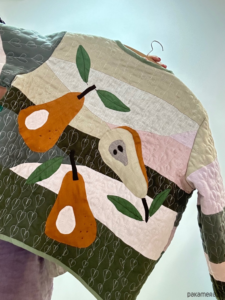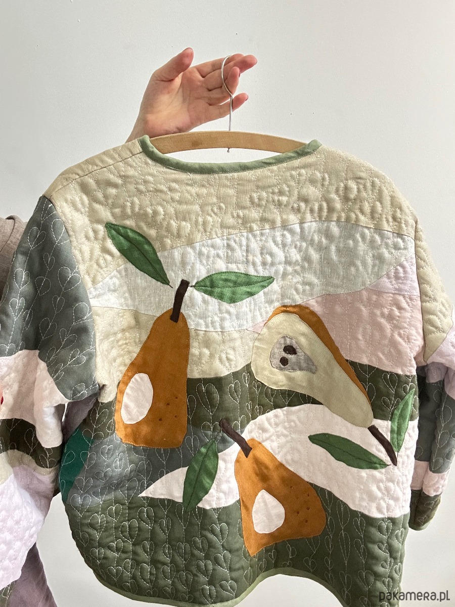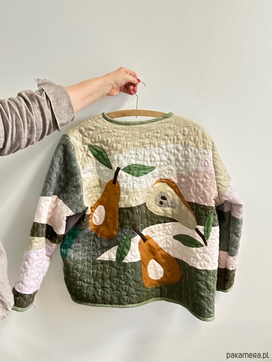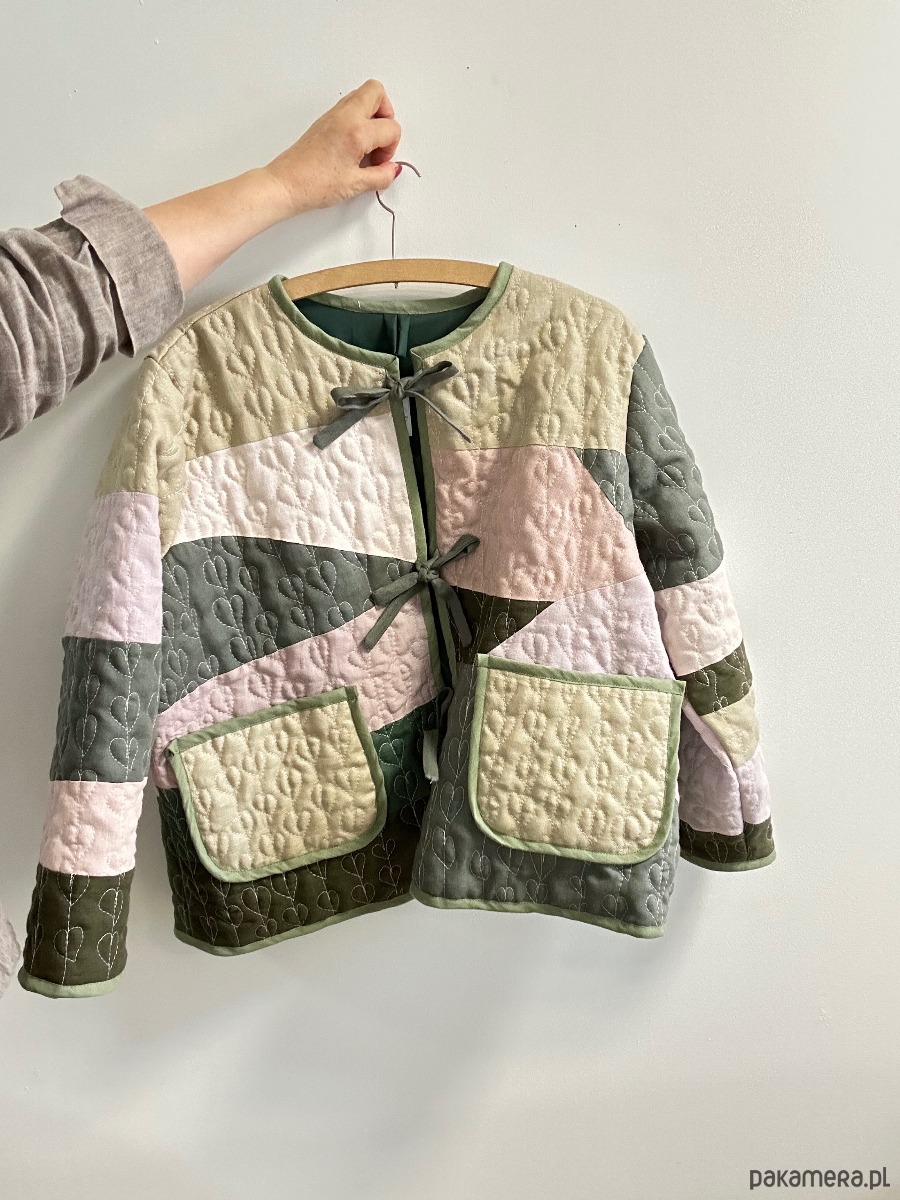 Autorski wzór patchworkowej kurtki i naszywanymi aplikacjami. Pikowana fantazyjnie różnymi technikami, ręcznie prowadzoną maszyną. Wykonana ze 100% lnu produkcji europejskiej, lekkiego wypełnienia oraz bawełnianej podszewki.Zapinana na kokosowe guziki.