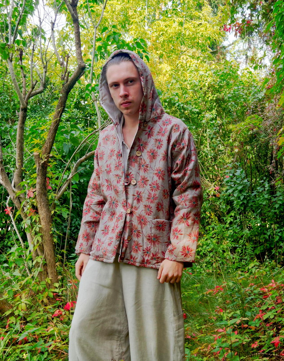 Kurtka - kufajka ocieplana w kolorze beżu nasączonego w kwiaty ze lnu ( 100% len) z kapturem.