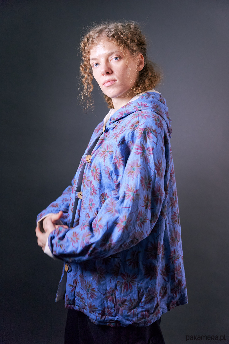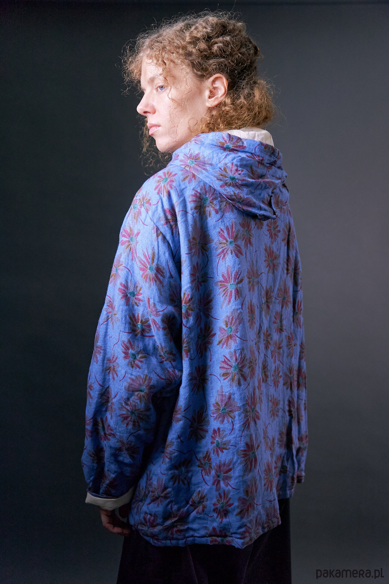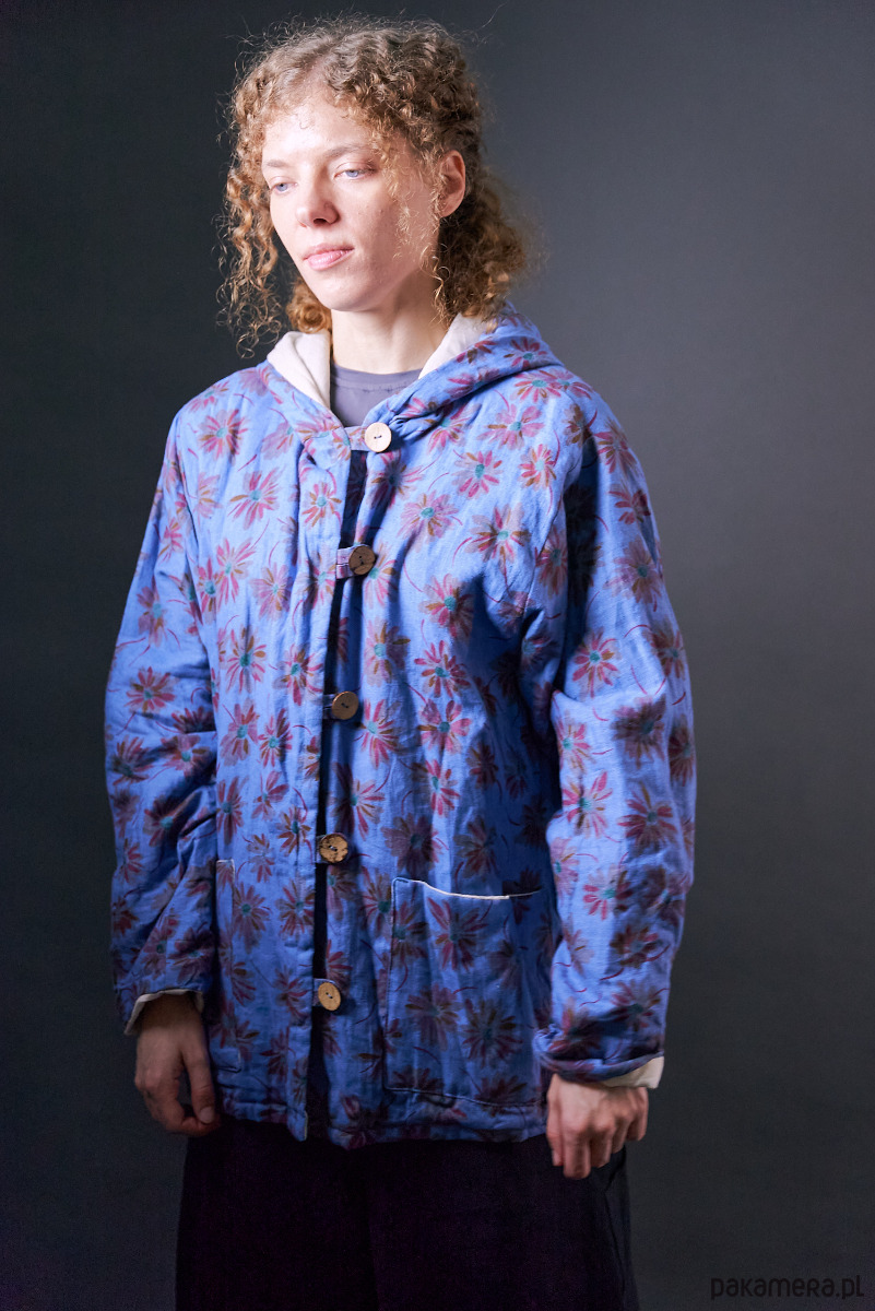 Kurtka - kufajka ocieplana błękitna w kwiaty ze lnu ( 100% len) z kapturem.