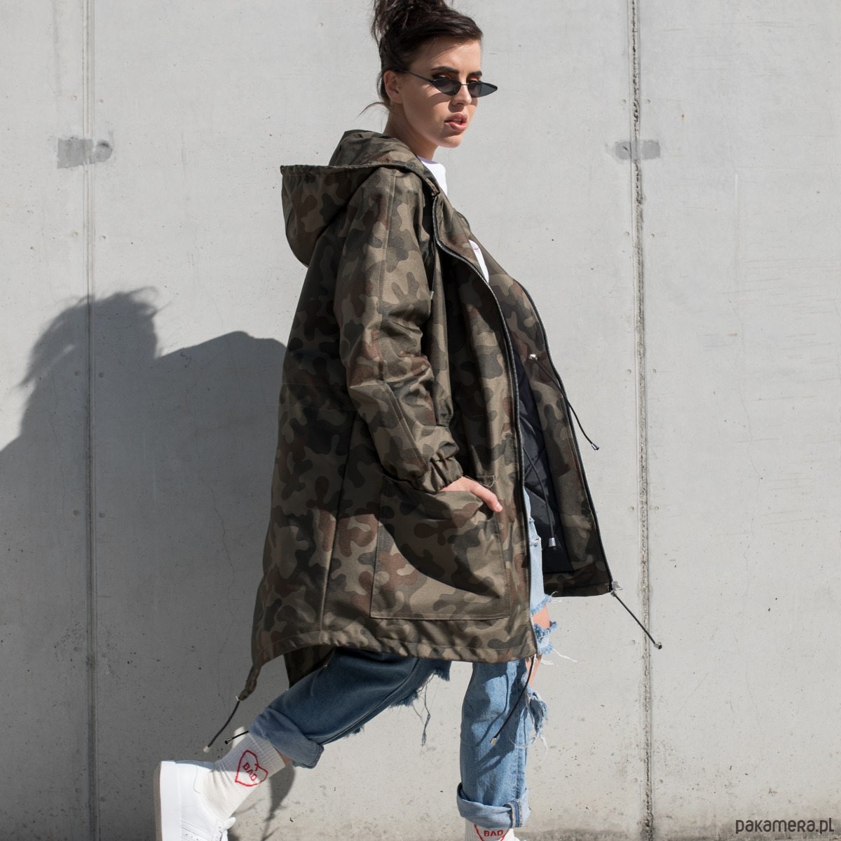 Uszyta z przeciwdeszczowej tkaniny w print moro, który świetnie komponuje się z każdym typem urody