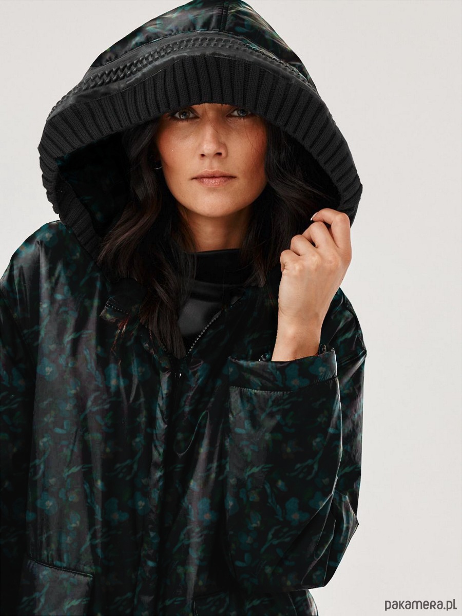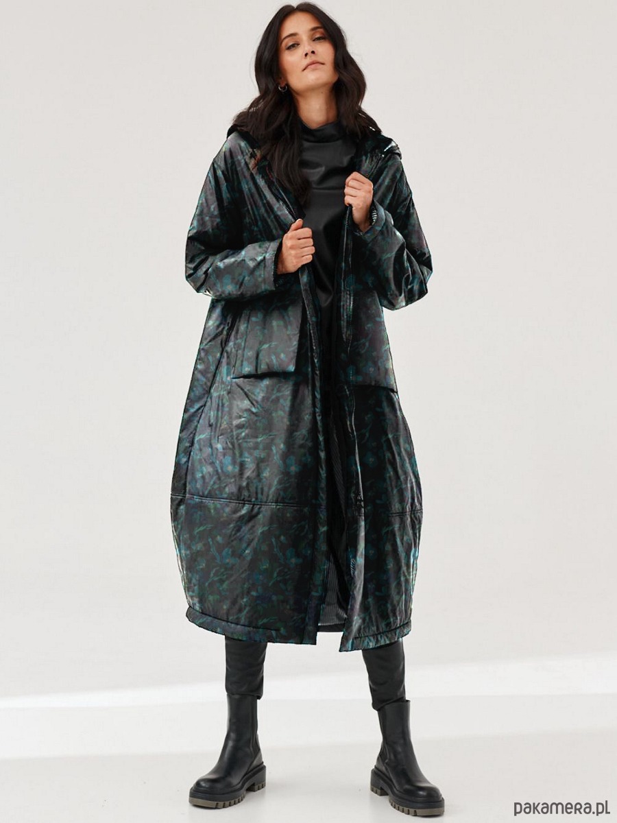 Kurtka Afera z ultra lekkiej tkaniny. Forma kurtki to ciekawy kształt kokonu. Kaptur wykończony strukturalnym swetrowym ściągaczem z ozdobną taśmą - wegańską "skórką". Na przodzie naszywane, lekko przestrzenne kieszenie. Kurtka - płaszcz jest ocieplany i wykończony od środka podszewką. Kurtka zapina na zamek kostkowy, dwustronny.