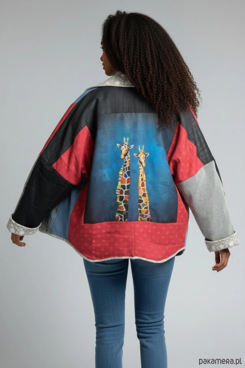 Na plecach znajduje się efektowny panel z motywem żyraf, który nadaje kurtce wyjątkowego charakteru i przyciąga uwagę. Różnorodne faktury – jeans, tkaniny bawełniane, kontrastowe wstawki – tworzą niepowtarzalny patchworkowy efekt.