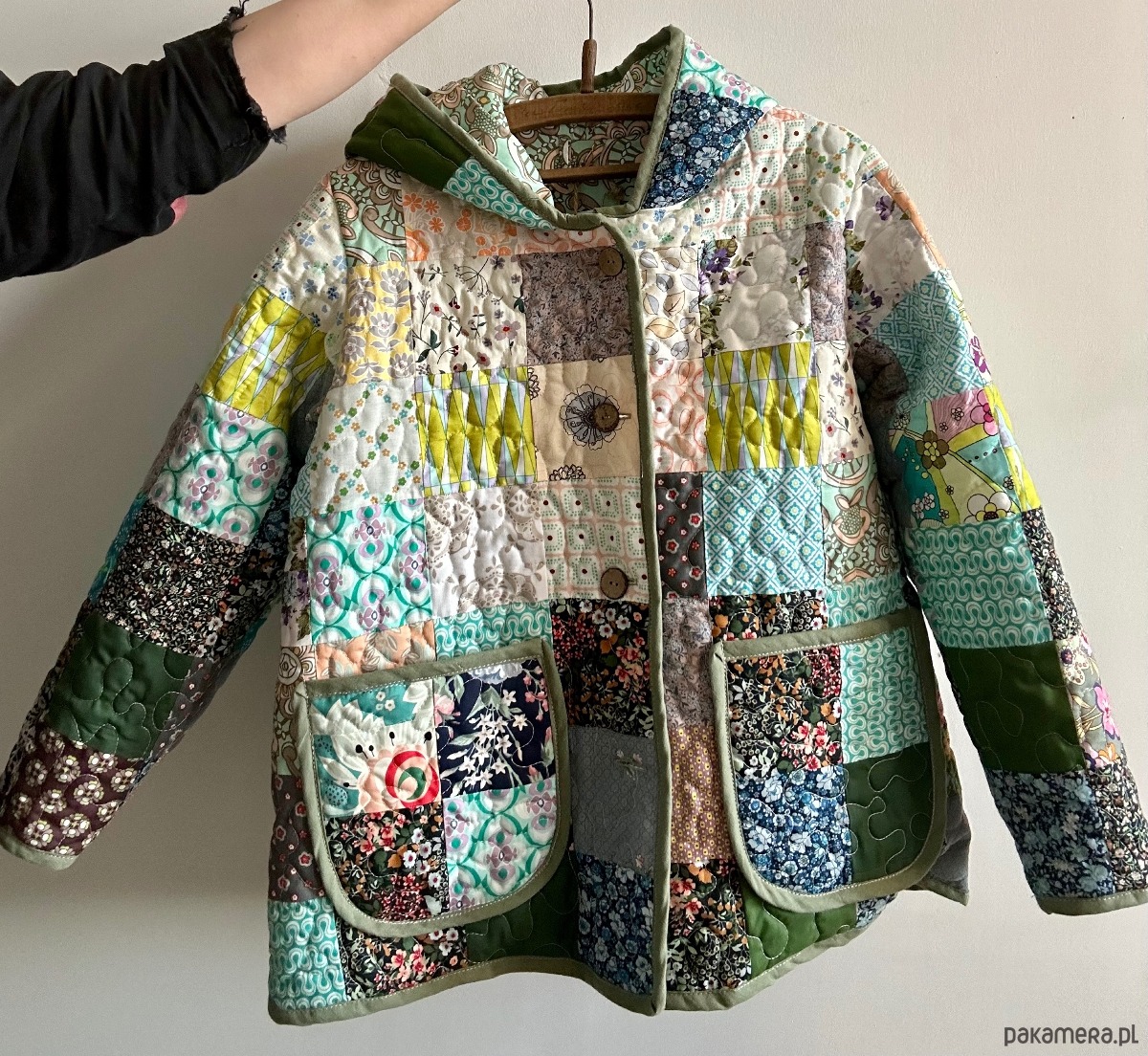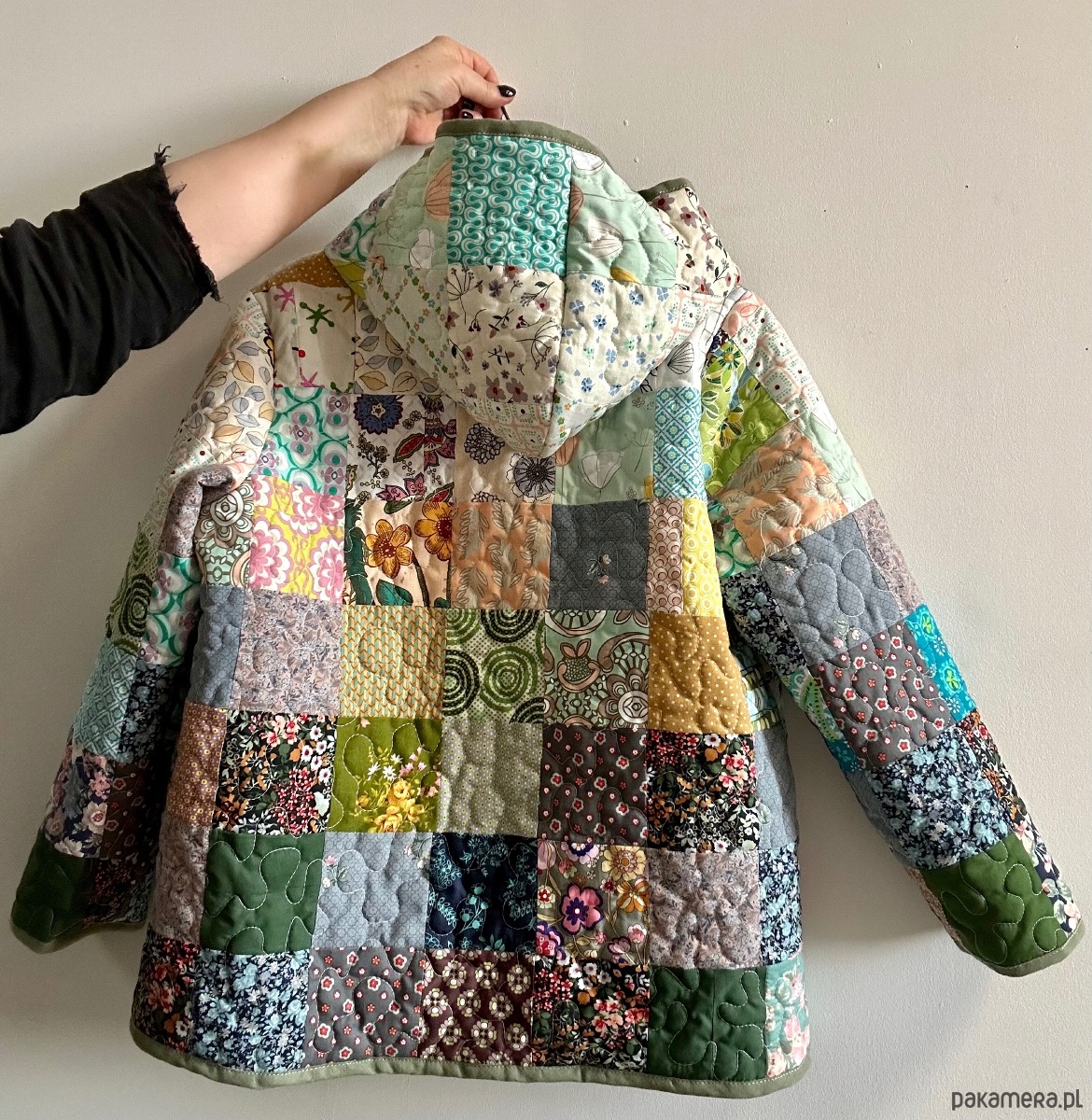 Kurtka patchworkowa z kapturem. Kolorowa, oversize'owa, zapinana na kokosowe guziki. Pikowana, wewnątrz podszewka z popeliny bawełnianej Art Gallery Fabrics. Sprawdż jak pięknie możesz wyglądać w patchworkowej, kolorowej kurtce.