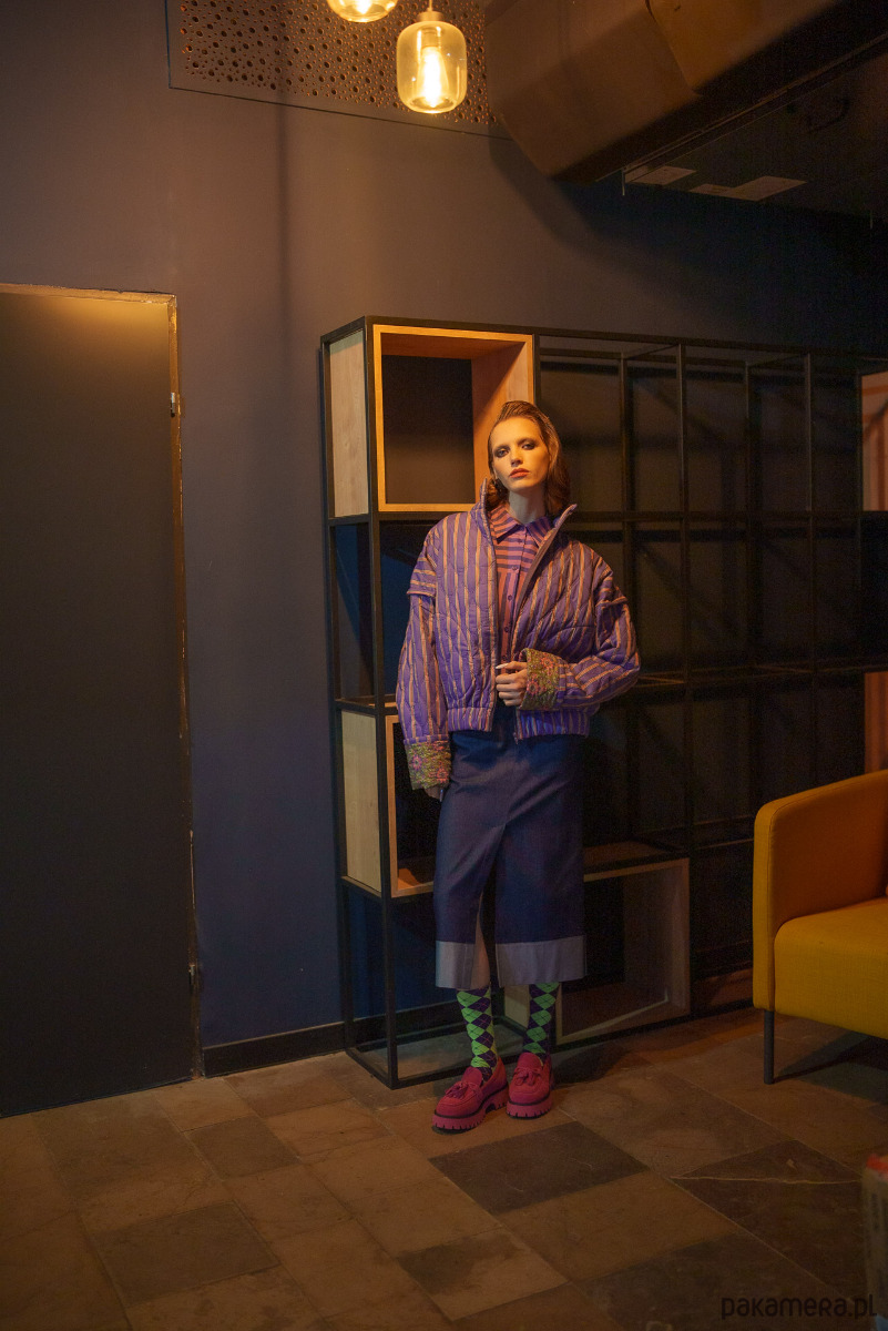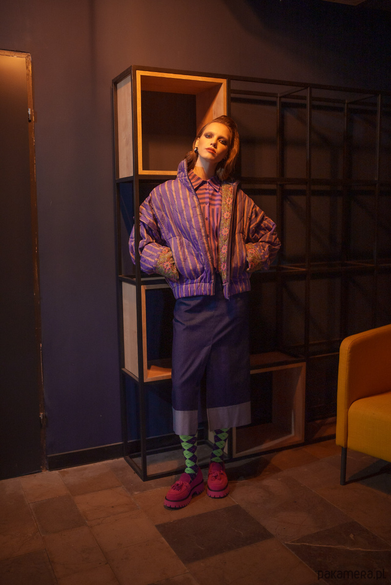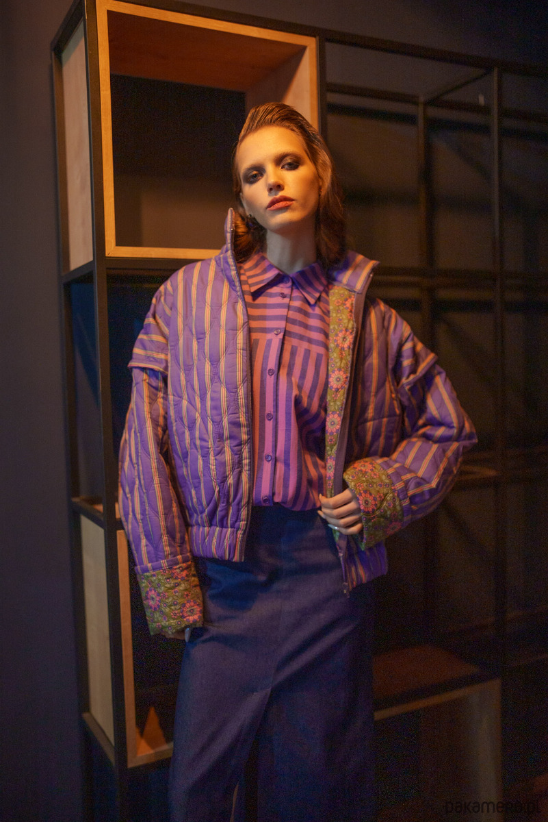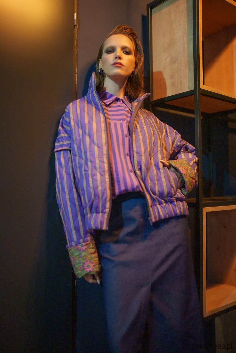 Stylowy design: Charakterystyczny wzór w poziome paski w odcieniach fioletu oraz kolorowe, kwiatowe akcenty na rękawach dodają kurtce wyjątkowego charakteru.