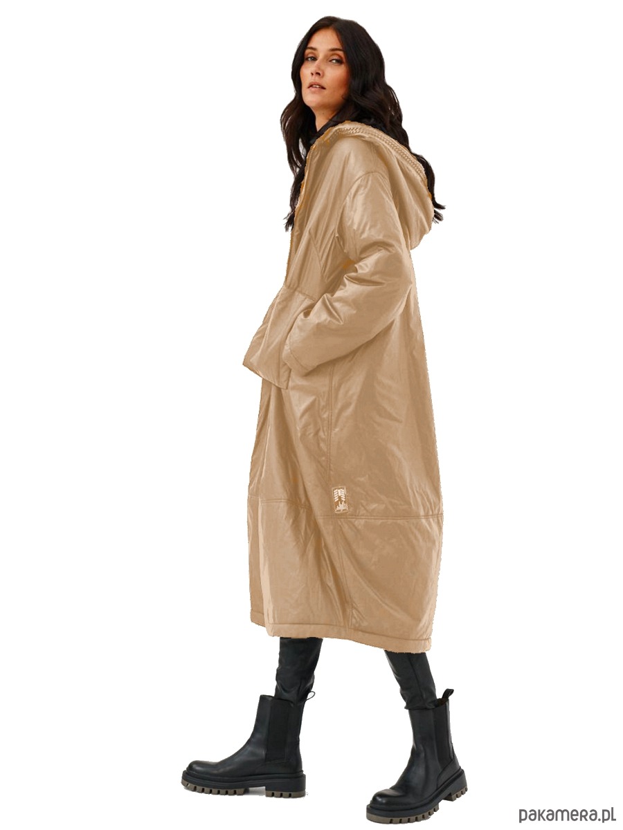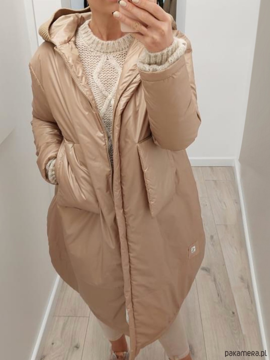 Kurtka Afera z ultra lekkiej tkaniny. Forma kurtki to ciekawy kształt kokonu. Kaptur wykończony strukturalnym swetrowym ściągaczem z ozdobną taśmą - wegańską "skórką". Na przodzie naszywane, lekko przestrzenne kieszenie. Kurtka - płaszcz jest ocieplany i wykończony od środka podszewką. Kurtka zapinana na zamek, dwukierunkowy.