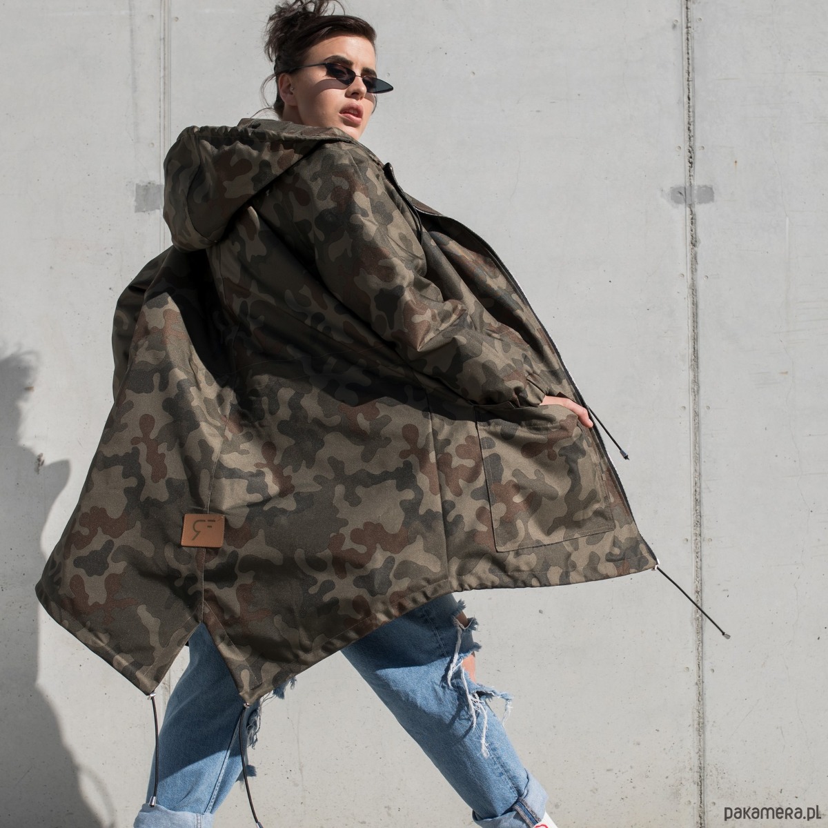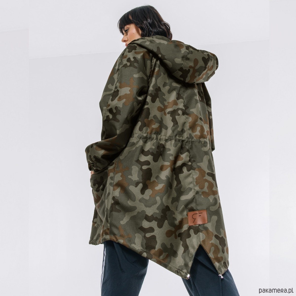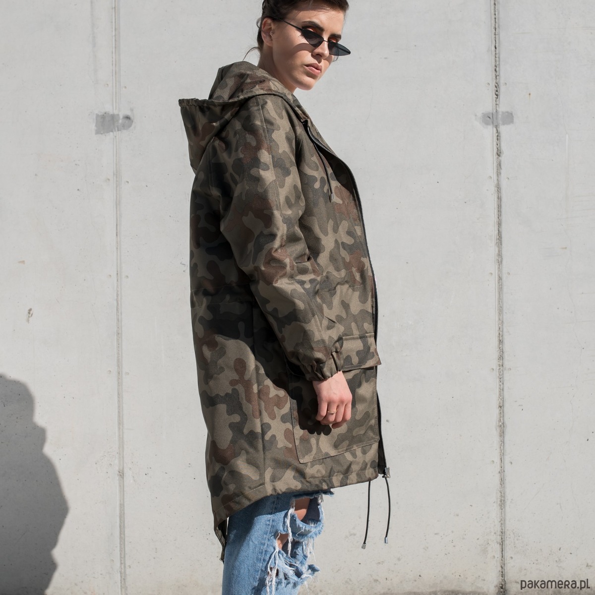 Uszyta z przeciwdeszczowej tkaniny w print moro, który świetnie komponuje się z każdym typem urody