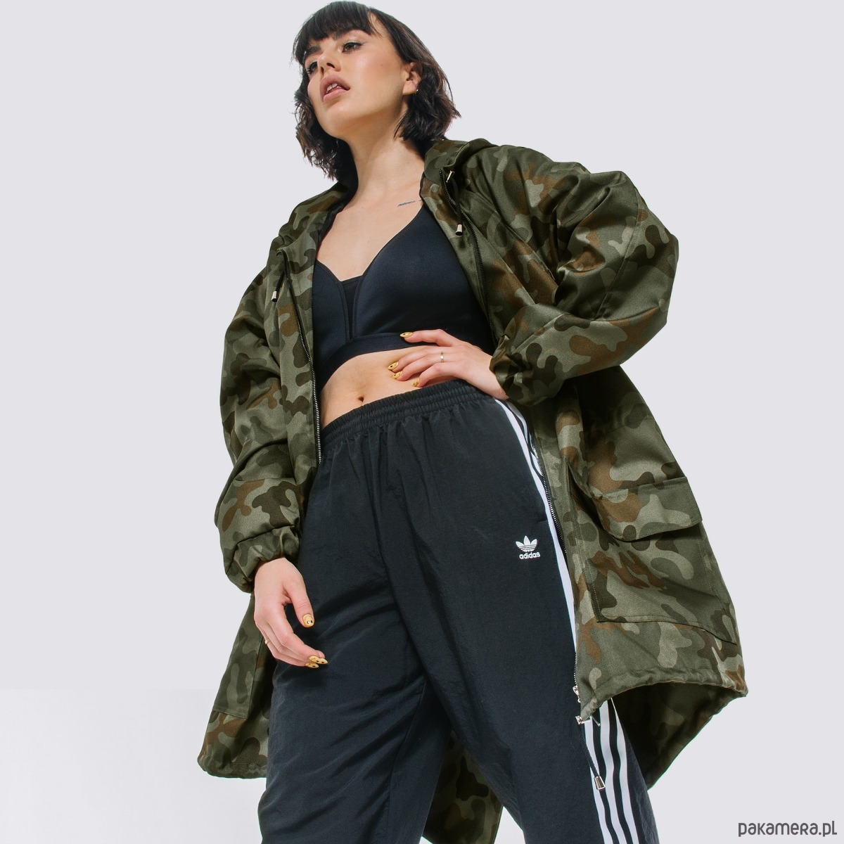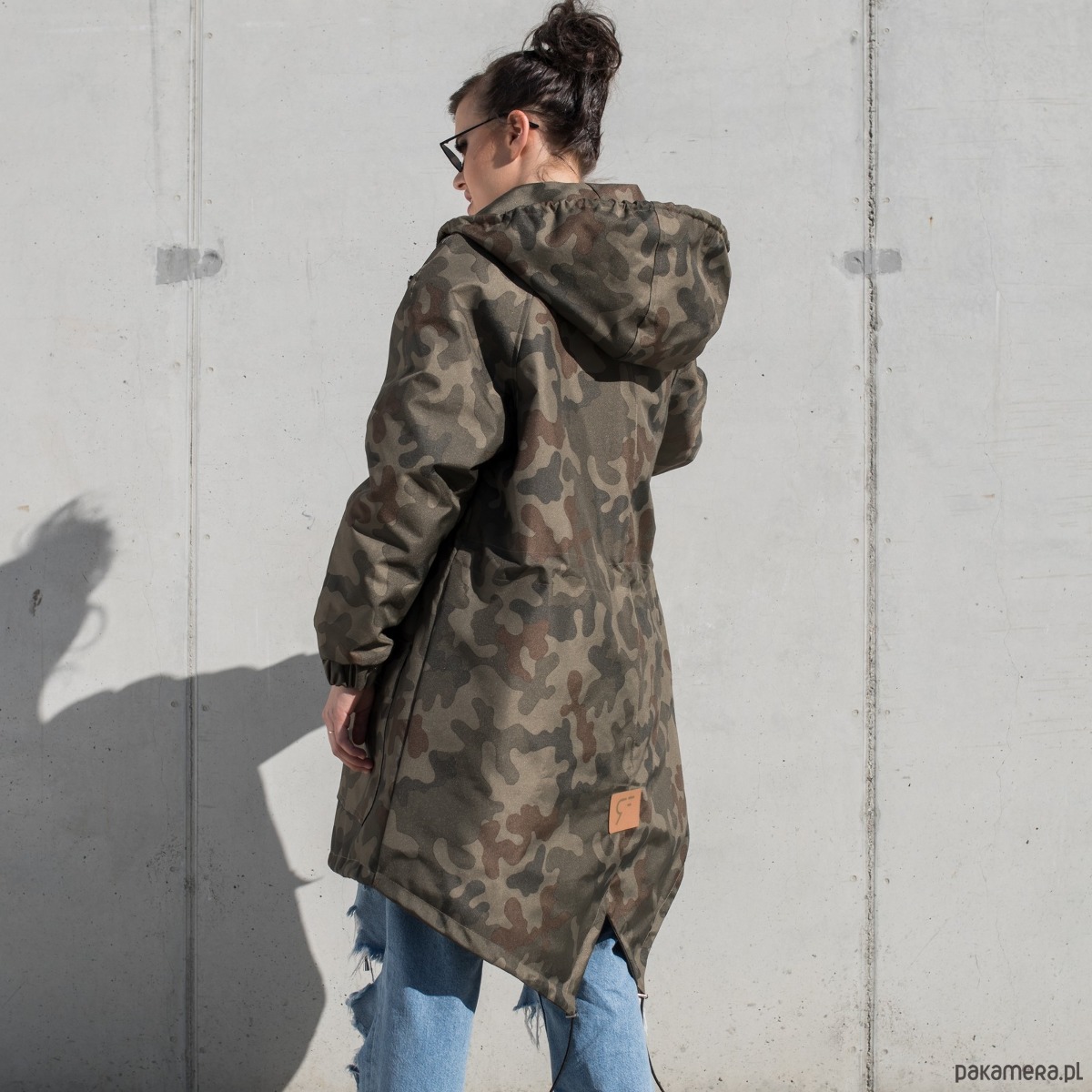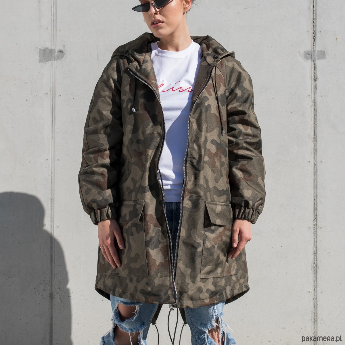 Uszyta z przeciwdeszczowej tkaniny w print moro, który świetnie komponuje się z każdym typem urody