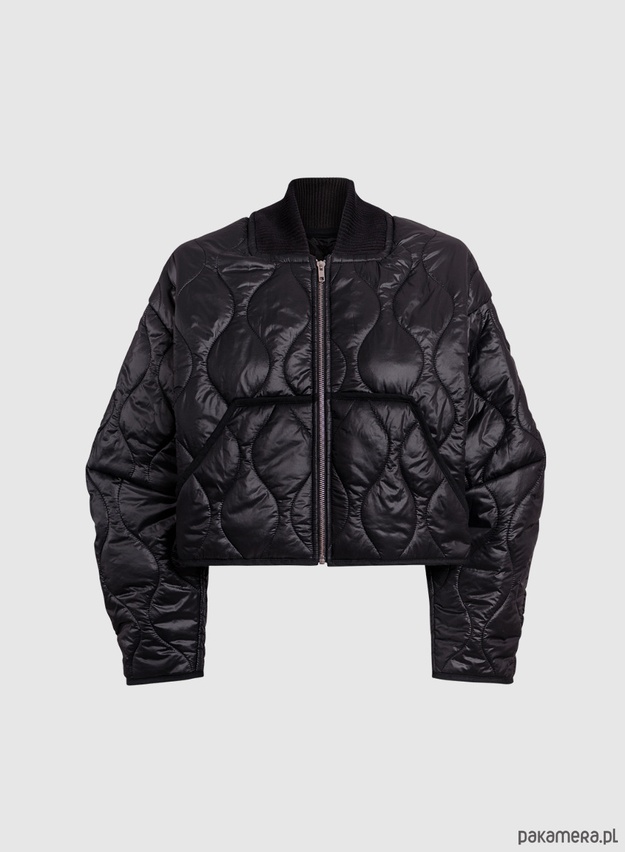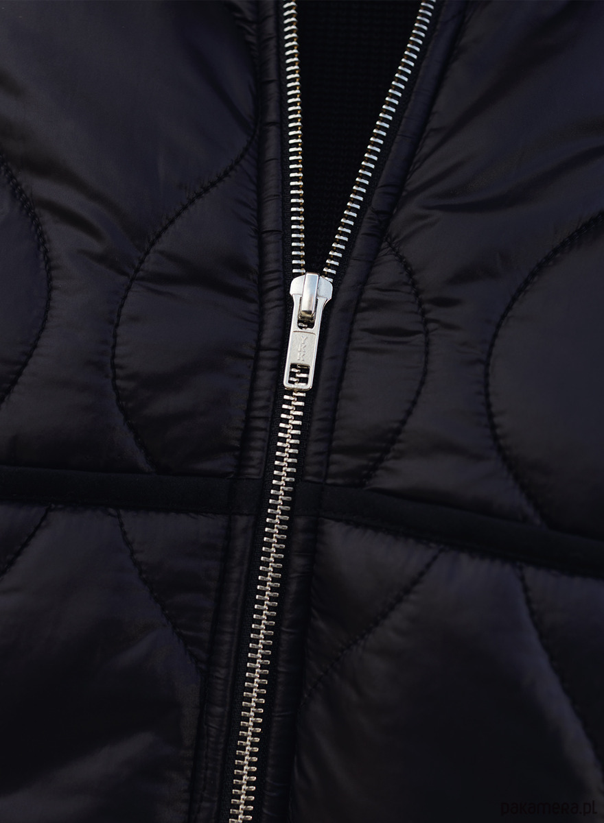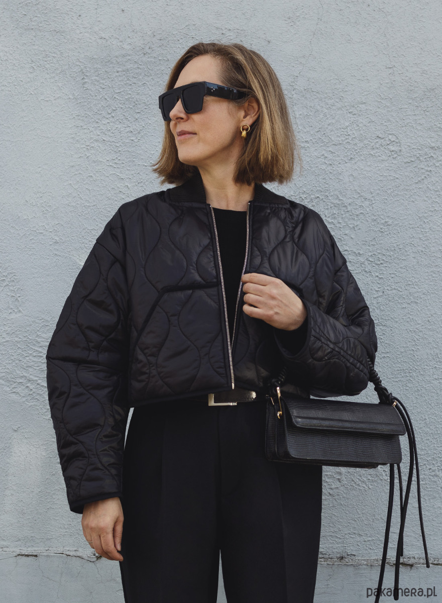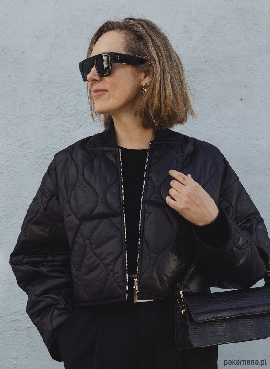 Krótka, cienka kurtka uszyta z czarnej pikówki. Dół i rękawy wykończone lamówką a dekolt bawełnianym ściągaczem. Bomberka posiada z przodu dwie kieszenie. Zapinana na metalowy zamek w kolorze srebrnym, z powłoką antyniklową zapobiegającą uczuleniom.