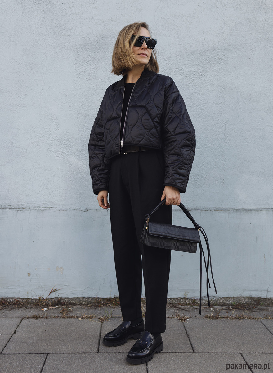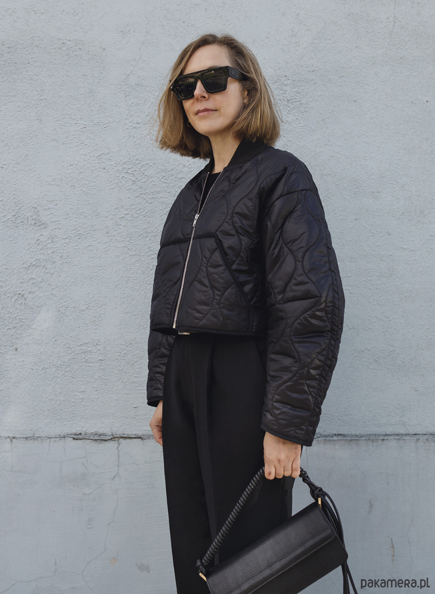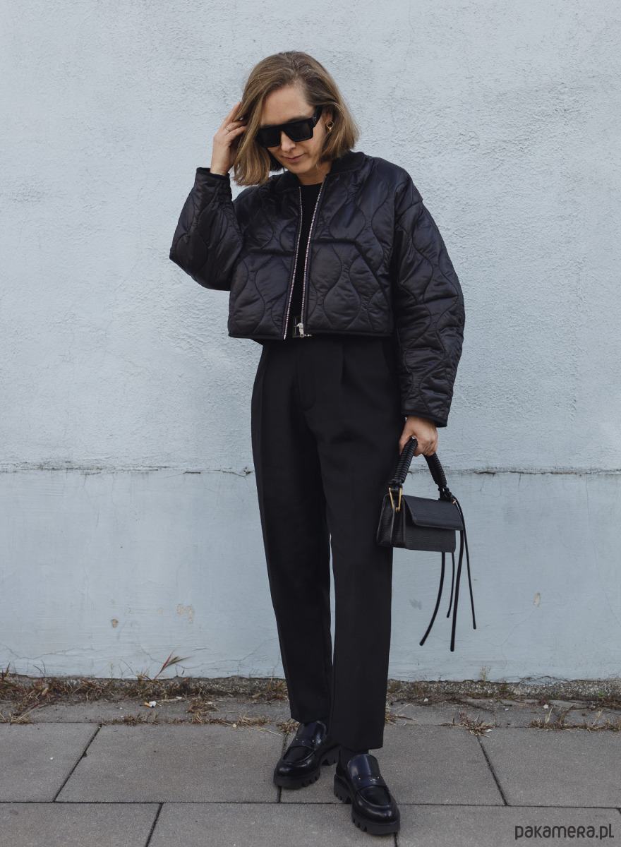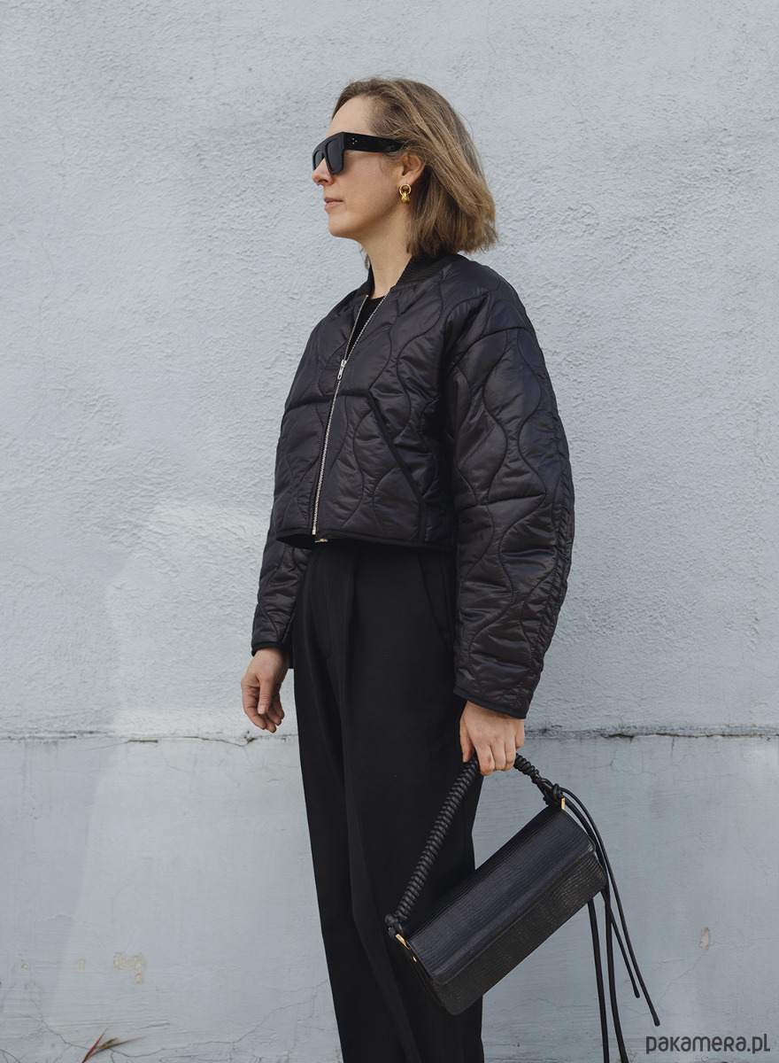Krótka, cienka kurtka uszyta z czarnej pikówki. Dół i rękawy wykończone lamówką a dekolt bawełnianym ściągaczem. Bomberka posiada z przodu dwie kieszenie. Zapinana na metalowy zamek w kolorze srebrnym, z powłoką antyniklową zapobiegającą uczuleniom.