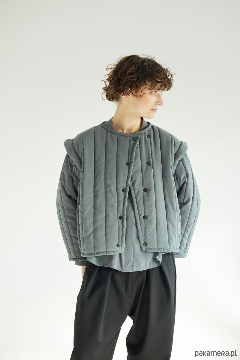 Delikatne przeskalowane ramiona oraz przesunięty front kurtki nadają kobiecy, miejski charakter.