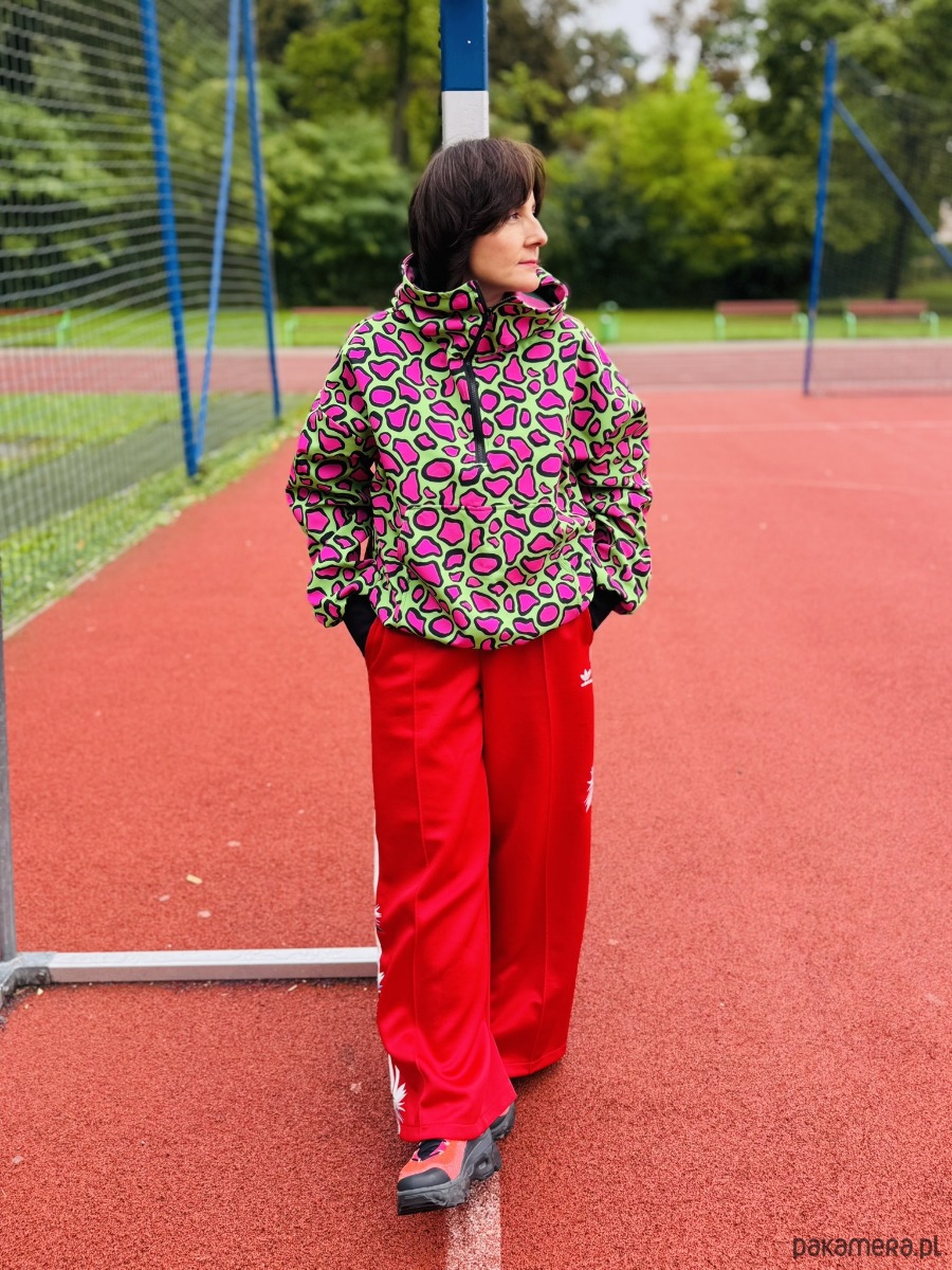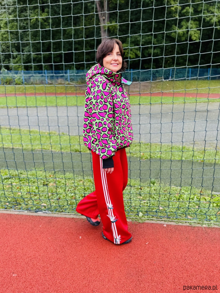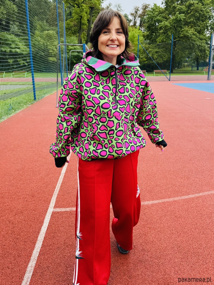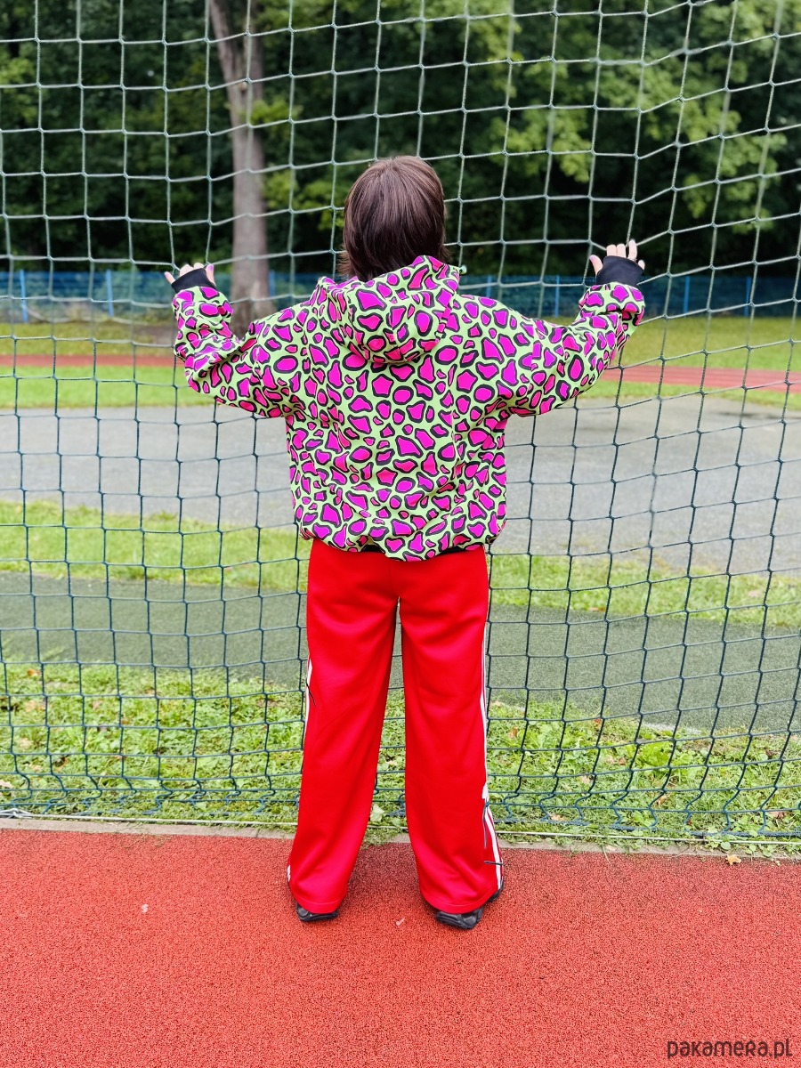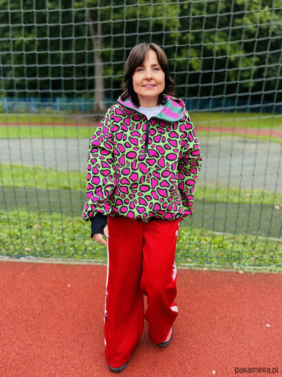 Kurtka w cętki różowo-zielone. Ściągacz i zamek w kolorze czarnym.