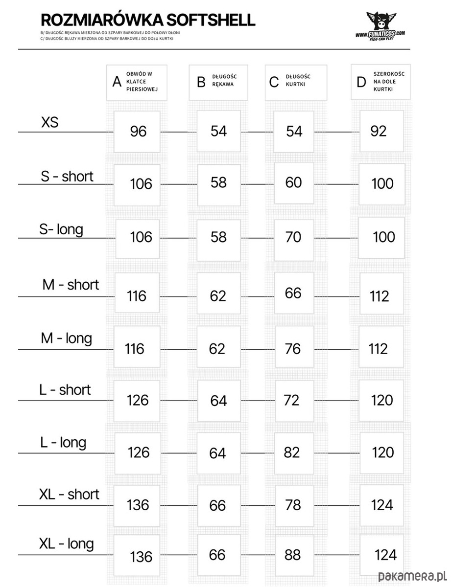 - materiał: softshell o parametrach wodoodporności 10 000 mm H₂O i oddychalności 5000 g/m2/day