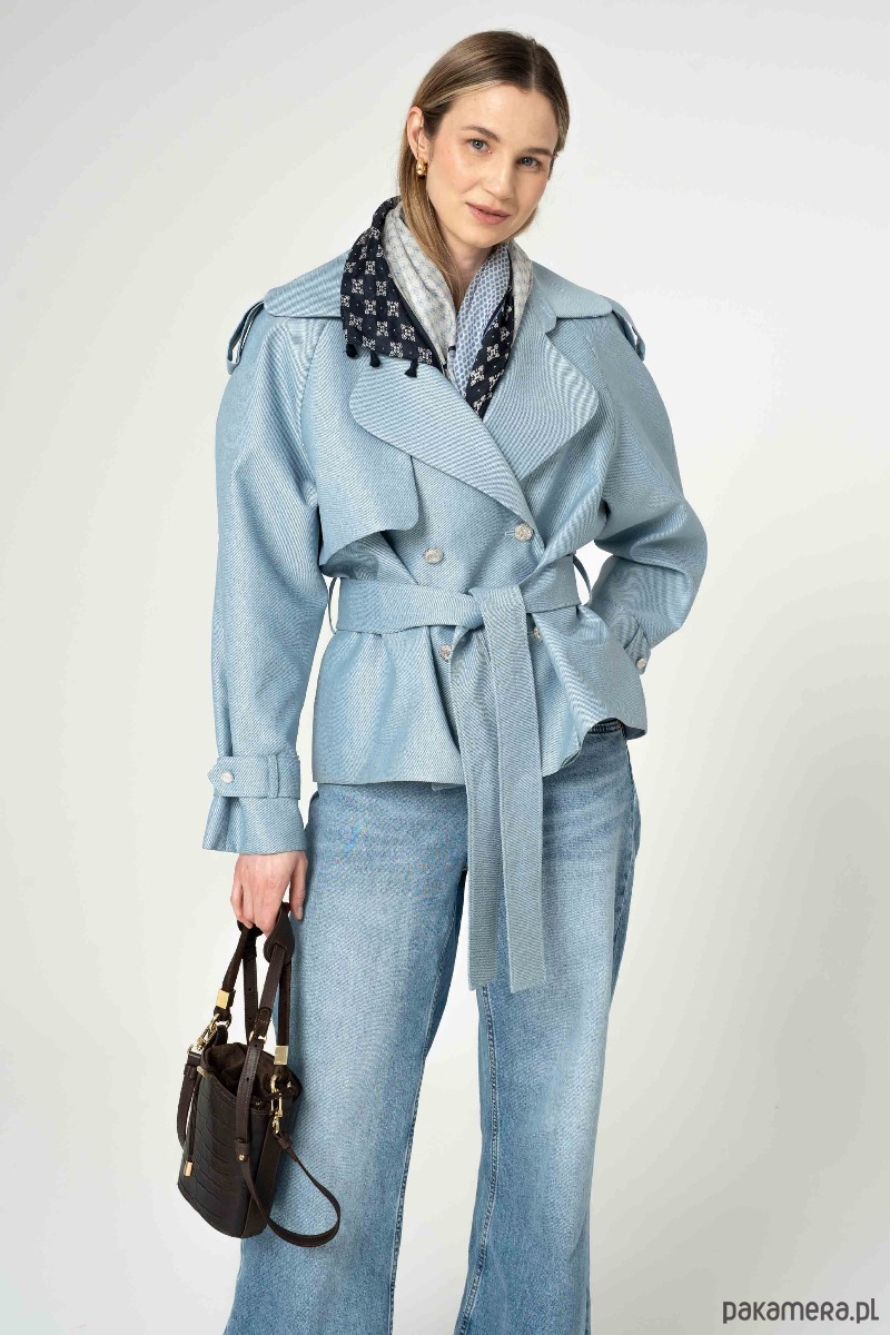 Nowoczesna kurtka trencz na bazie konstrukcji z lat 90-tych. Wykonany z bardzo wytrzymałej tkaniny w kolorze błekitnym. Wykończony srebrnymi metalowymi guzikami. Ortalion w prążek o matowym wykończeniu i wiskozowa podszewka. Zapięcie dwurzędowe, dodatkowo wiązanie paskiem.