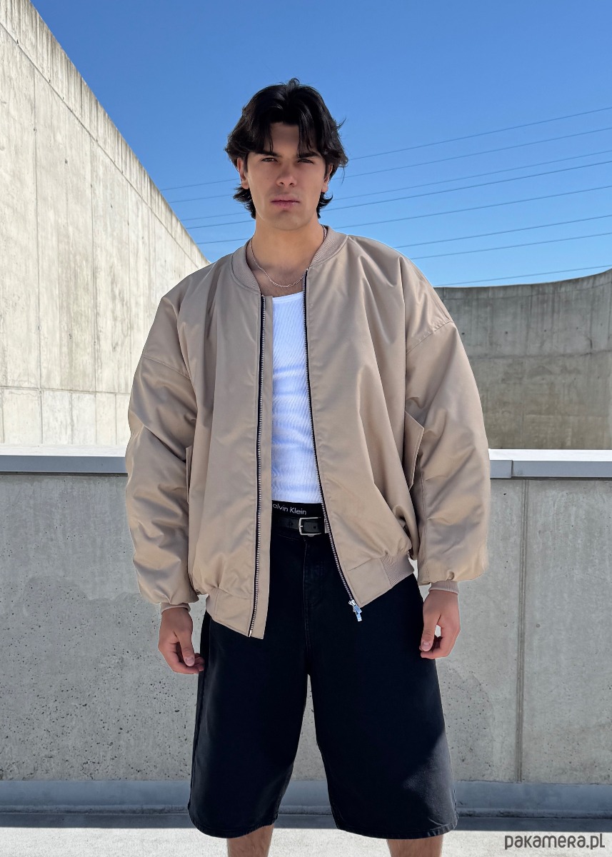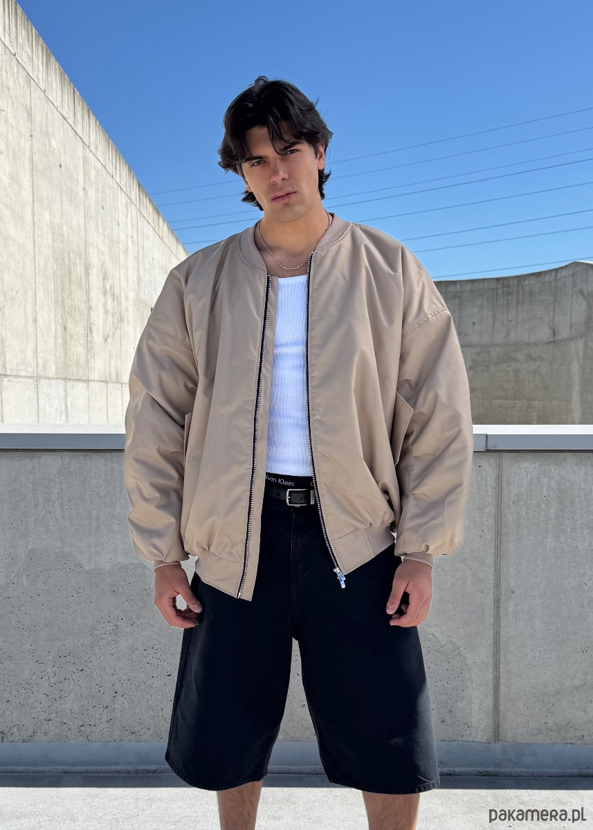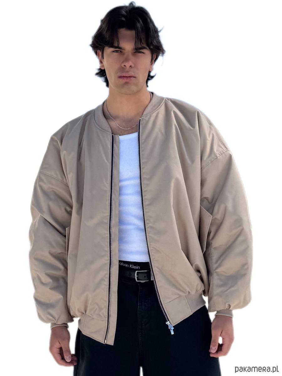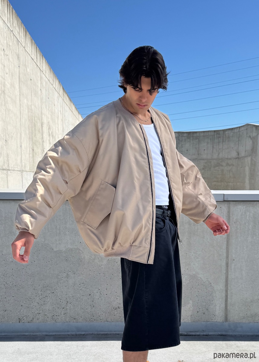 Mocno oversiz'owa kurtka typu bomber wykonana z przeciwdeszczowej tkaniny w kolorze mocca / ciemnego beżu, zapinana na metalowy zamek z charakterystyczną patką