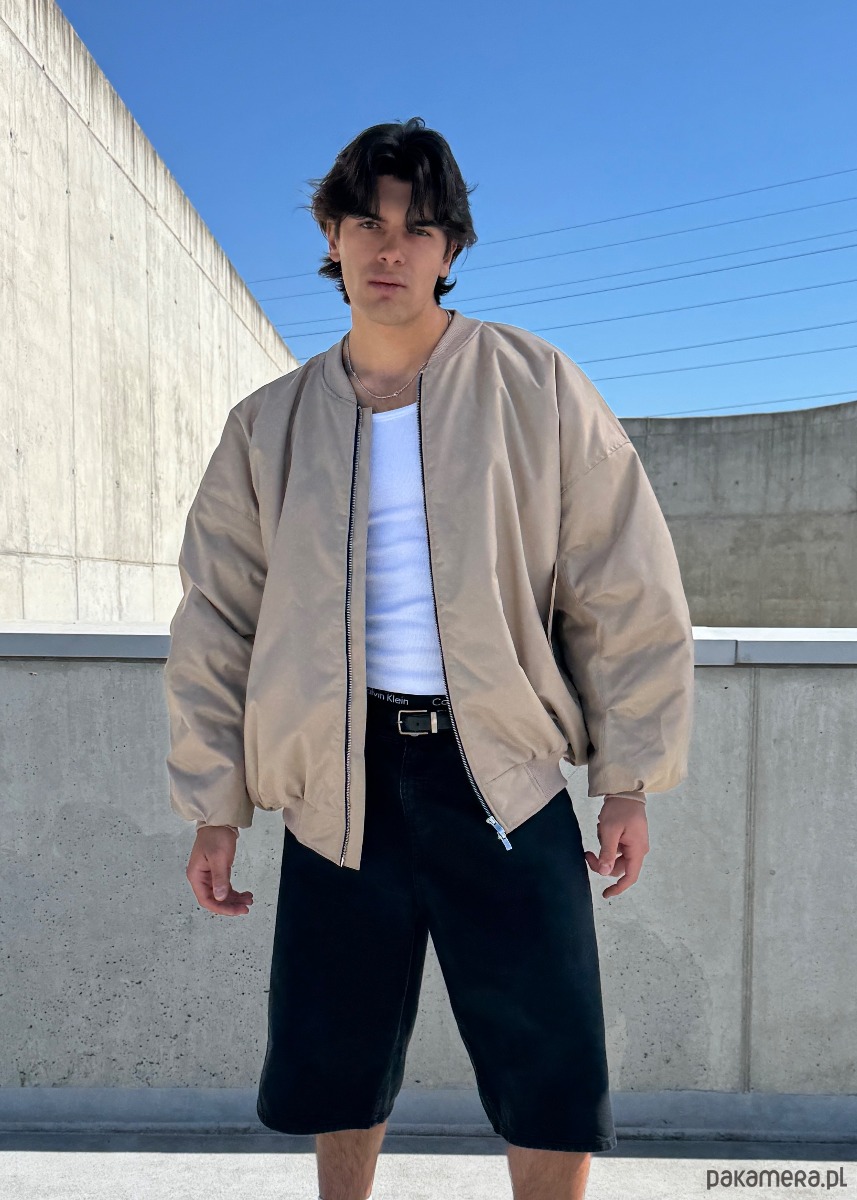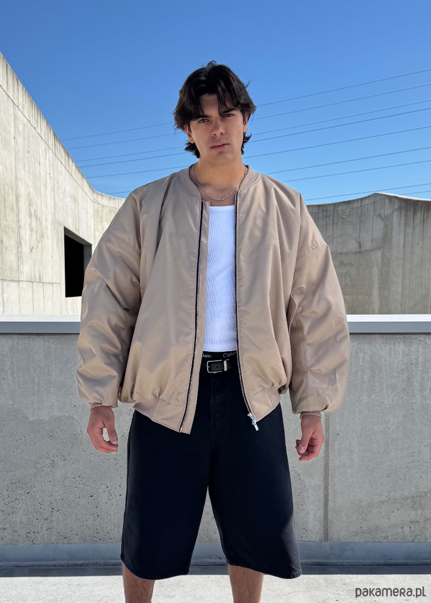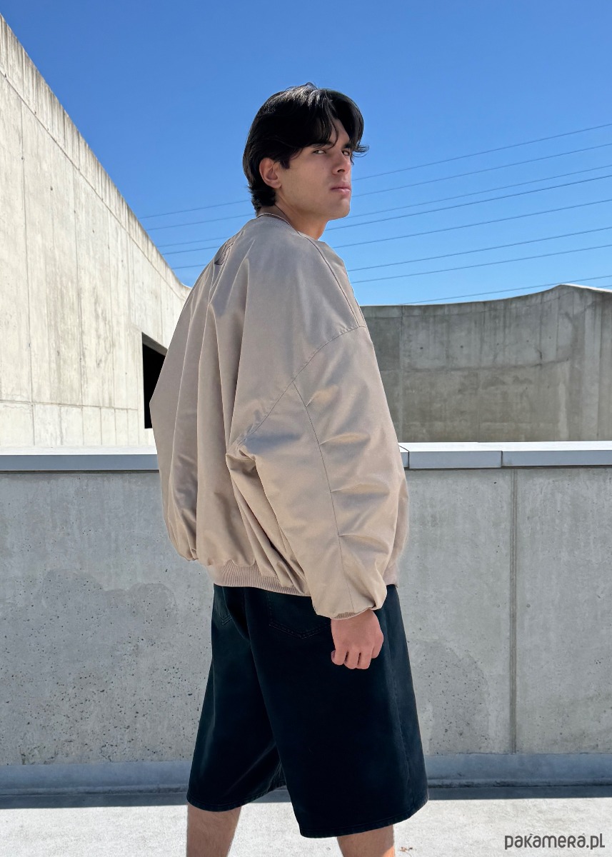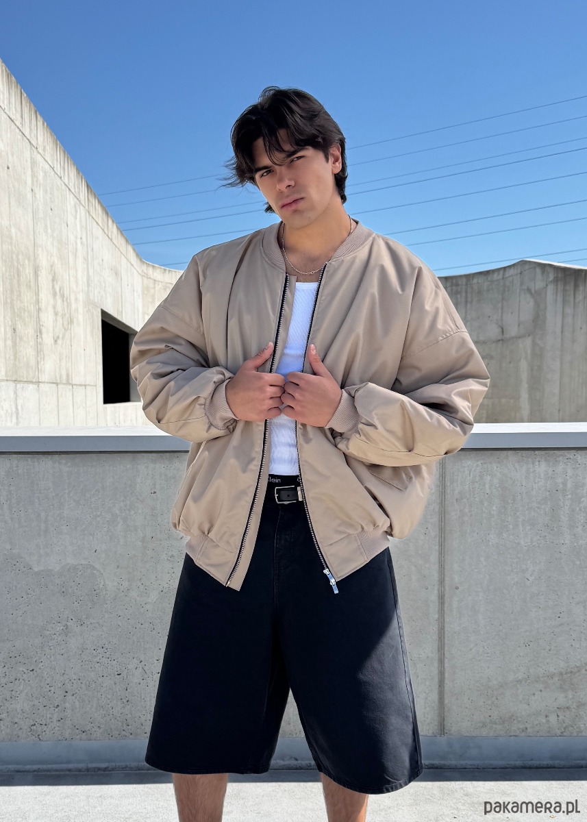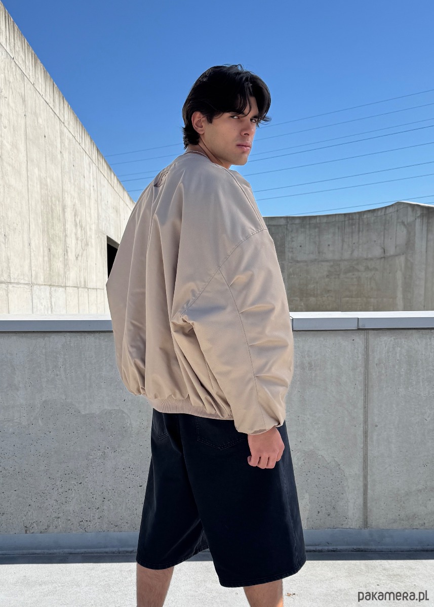 Mocno oversiz'owa kurtka typu bomber wykonana z przeciwdeszczowej tkaniny w kolorze mocca / ciemnego beżu, zapinana na metalowy zamek z charakterystyczną patką
