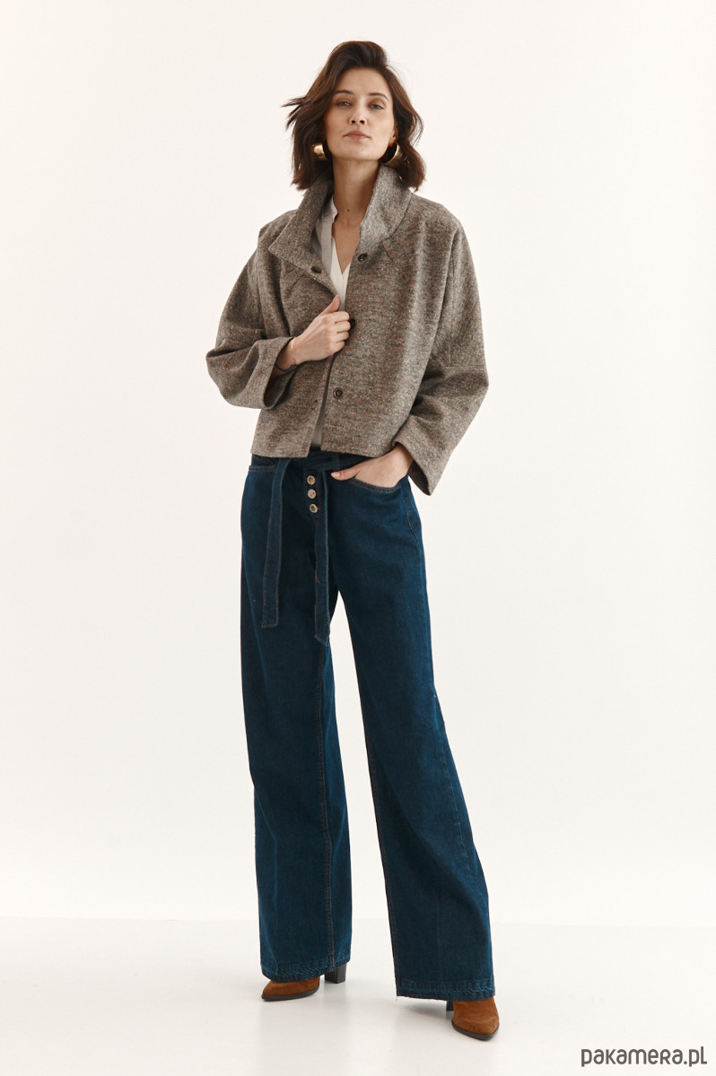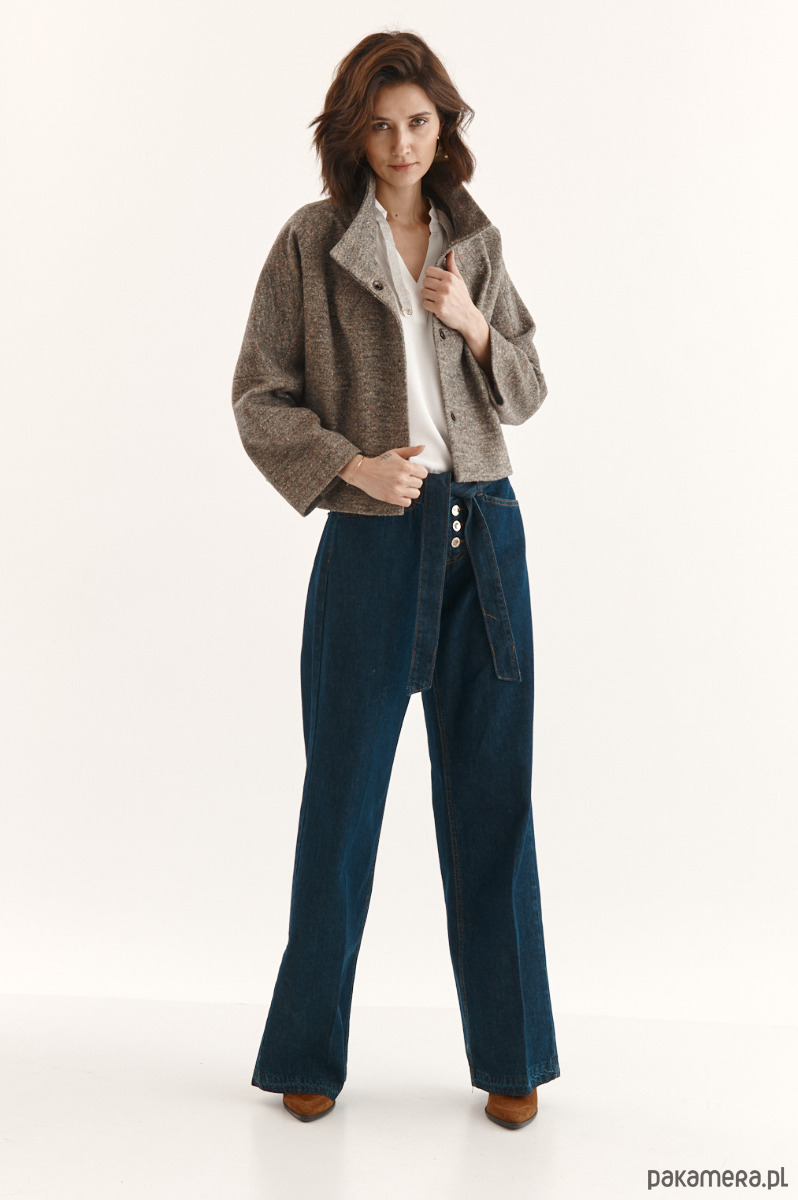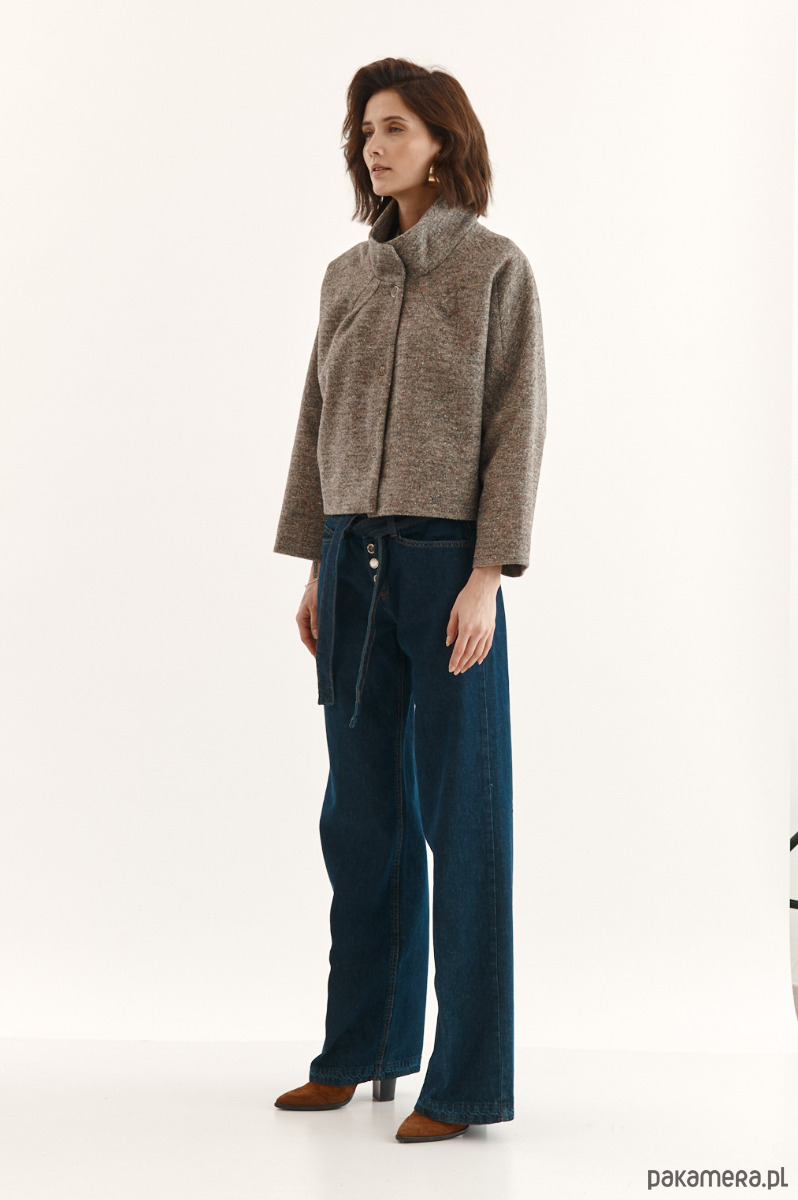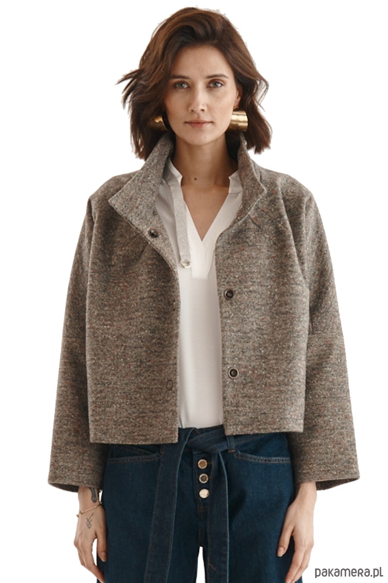 Kurtka ALVA to kurtka z melanżowego flauszu. Beżowy melanżowy flausz jest w delikatne, malutkie kolorowe kropeczki. Forma kurtki to ciekawy kształt pudełka. Kurtka ma stójkę. Kurtka jest zapinana na 3 napy-springi. Kurtka od środka wykończona piękną podszewką w kolorze kamizelki - karmel.