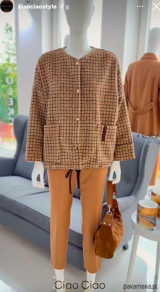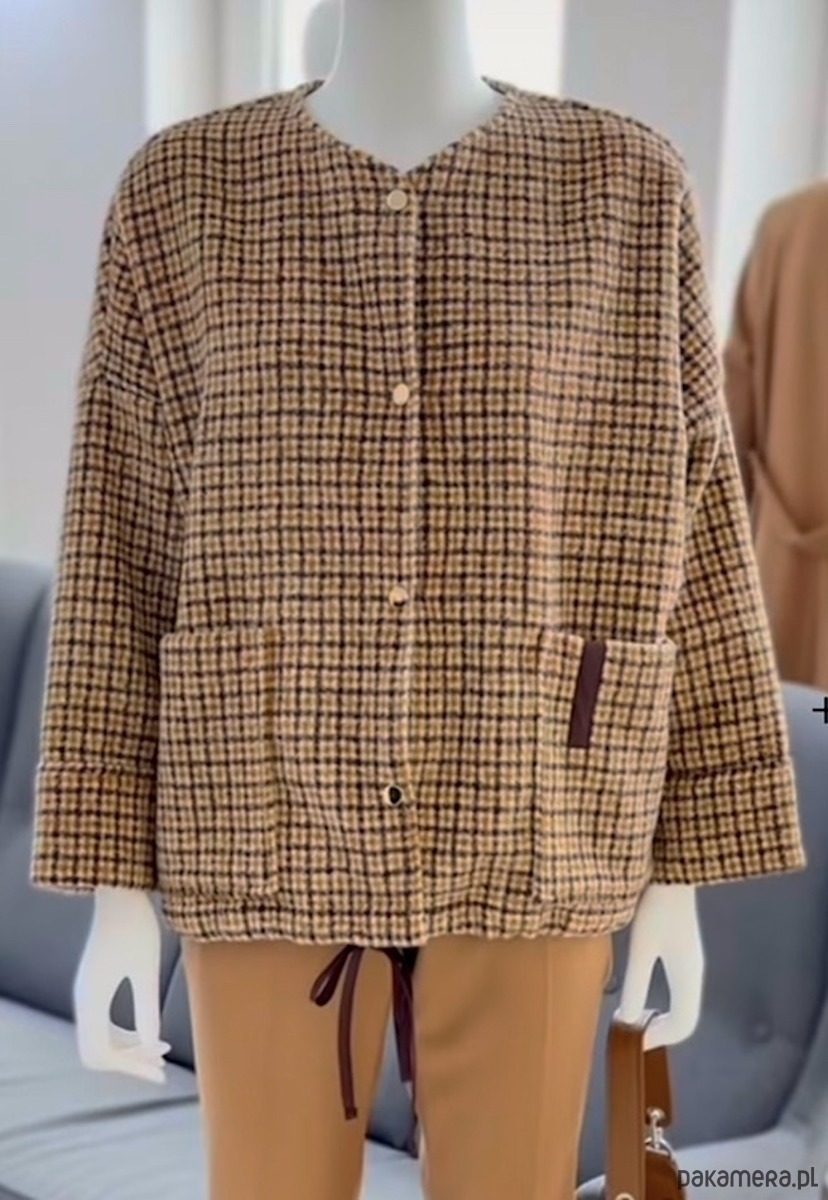 Kurtka Irma to kurtka z tkaniny z flauszowym - włochatym wykończeniem. Tkanina jest miękka i mięsista, gdzie mamy wzór krateczki. Forma kurtki to uniwersalny kształt pudełka - oversize. Na plecach jest kontrafałda. Dół jest zakończony tunelem z ozdobnym sznurkiem. Kurtka jest zapinana na złote napy . Kurtka od środka wykończona lamowką. Rękaw 7/8. Dostępna jeszcze w kolorze ecru i czarnym.