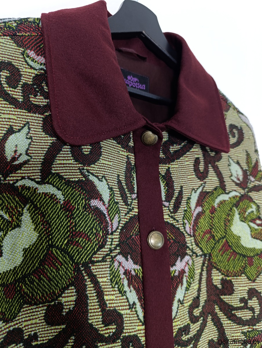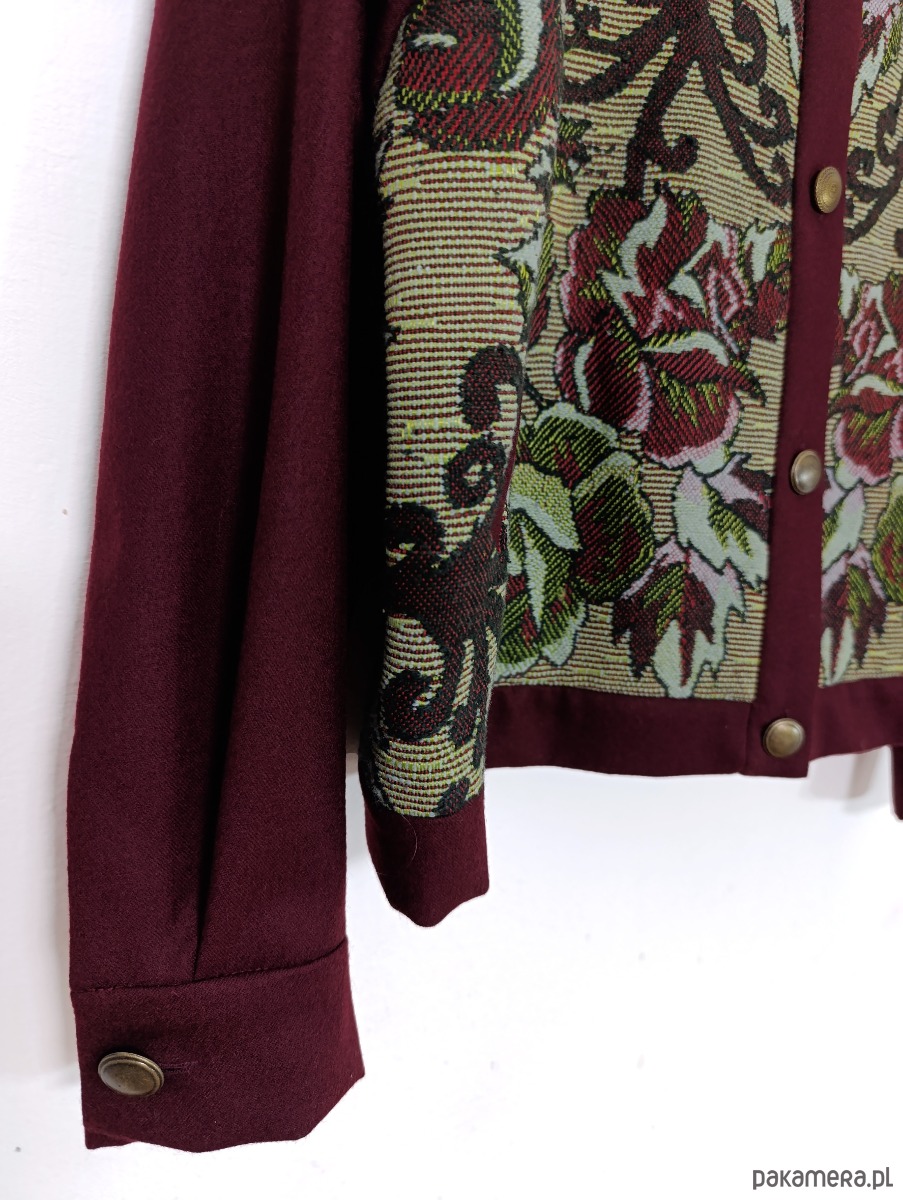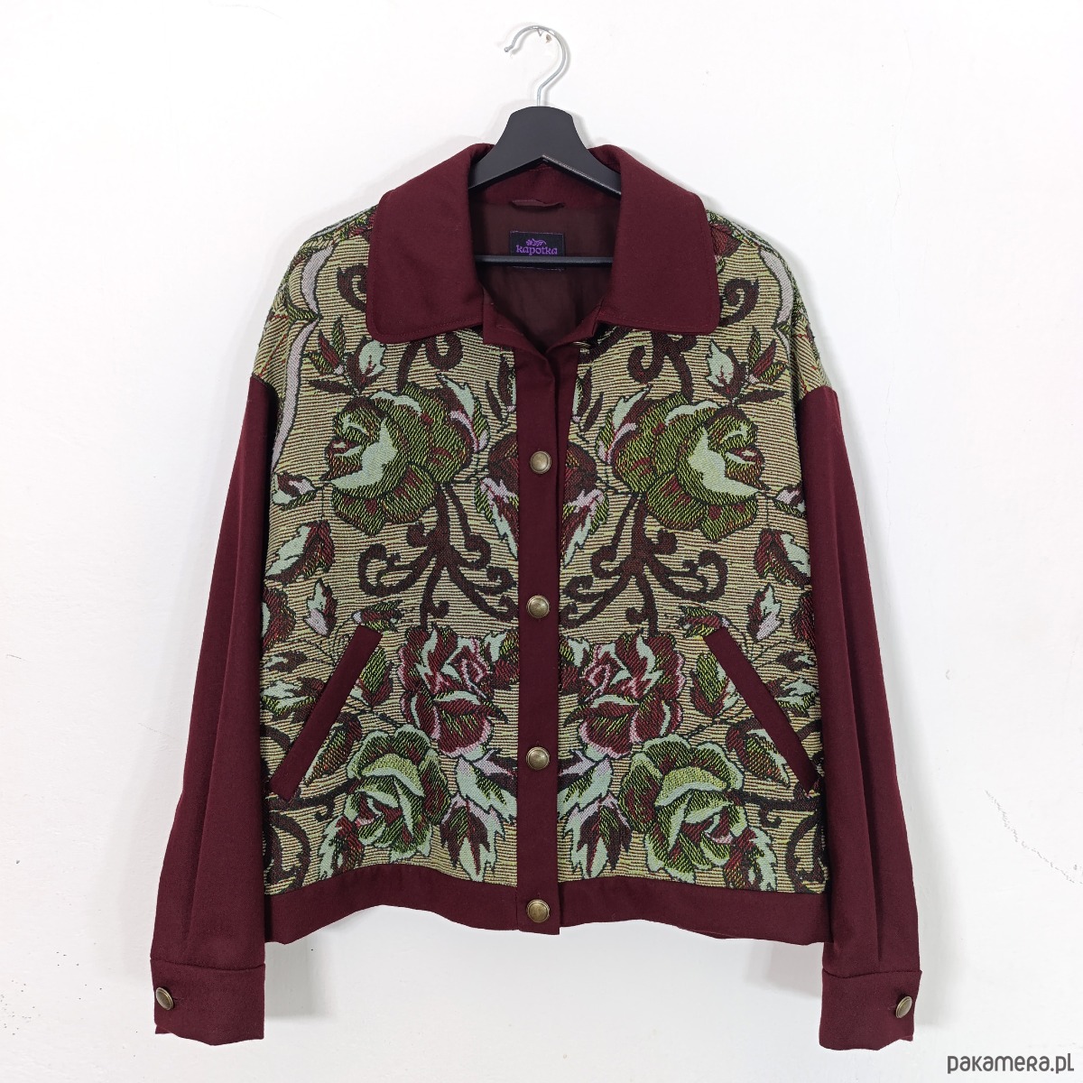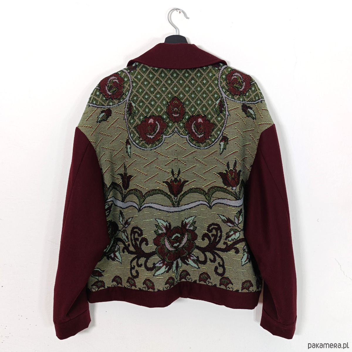 Upcyclingowa, wzorzysta kurtka o oversizowym kroju. Unisex. Uszyta z pięknej, żakardowej narzuty z okresu PRL-u. Zapinana na metalowe guziki, w kolorze starego złota. Kołnierzyk i rękawy kapotki wykonane są z bordowej wełny. Wygodne kieszenie po bokach oraz w środku. Wykończona w środku bawełnianą podszewką, miłą dla ciała. Idealna na jesień, wiosnę.