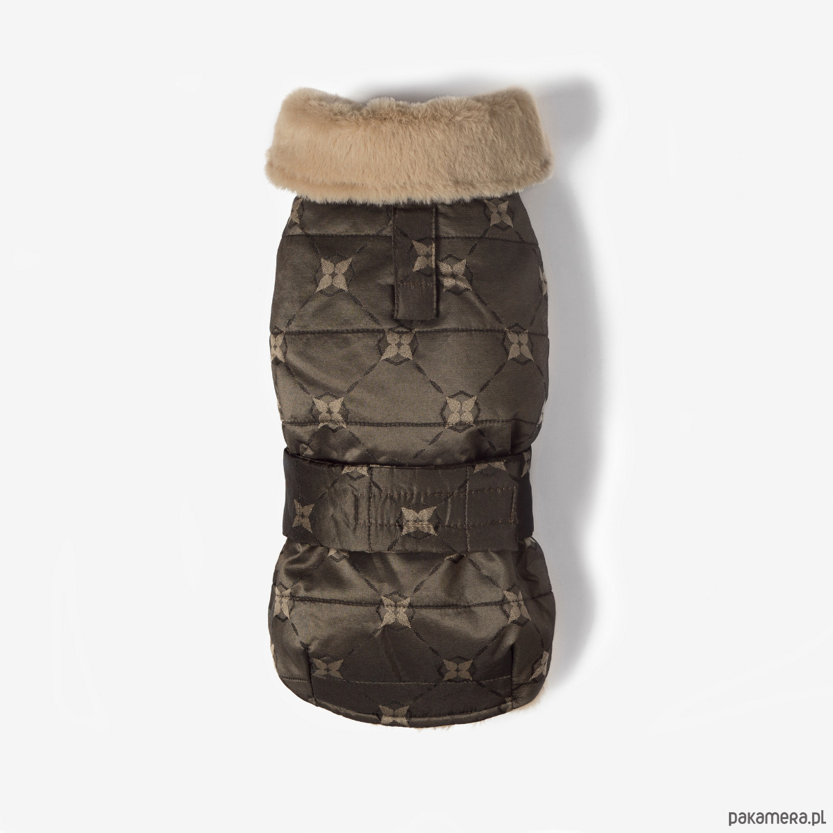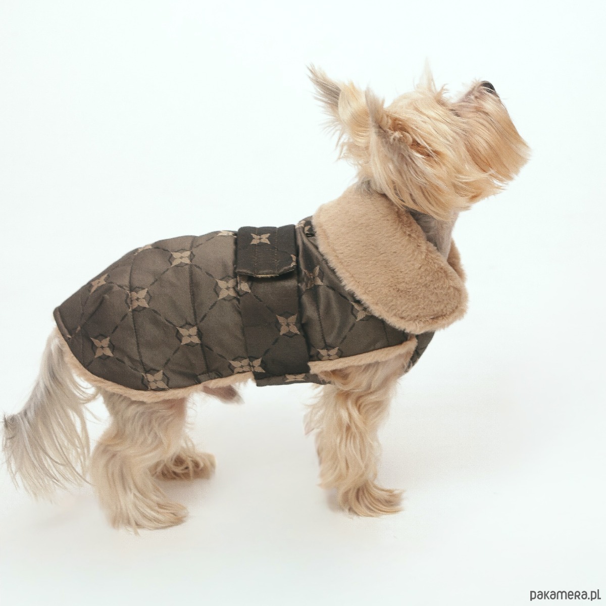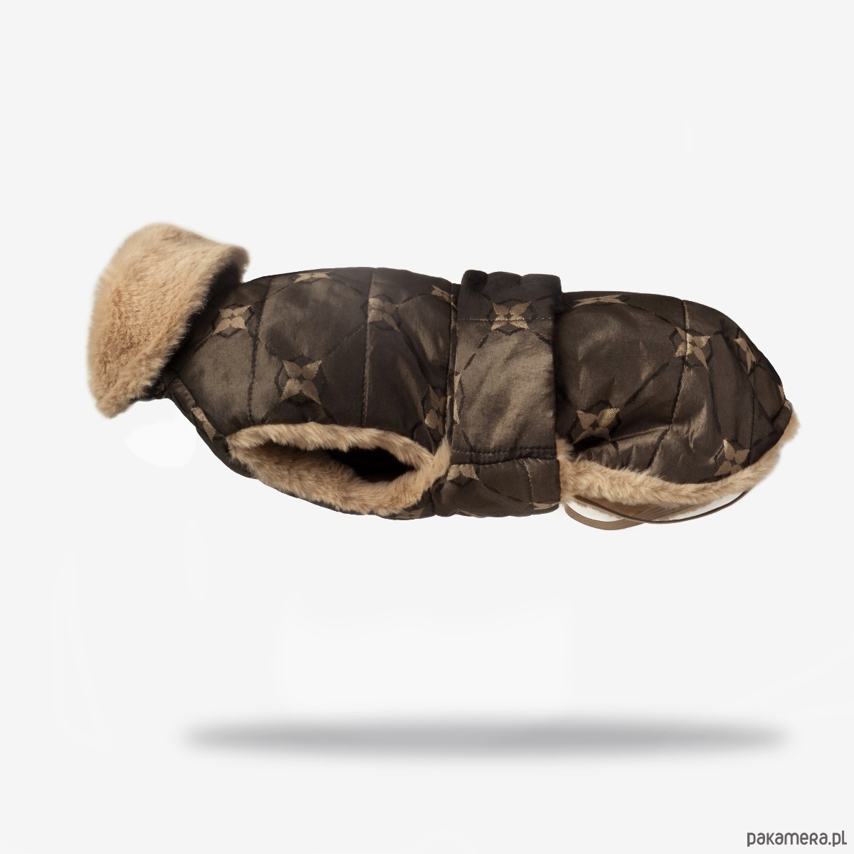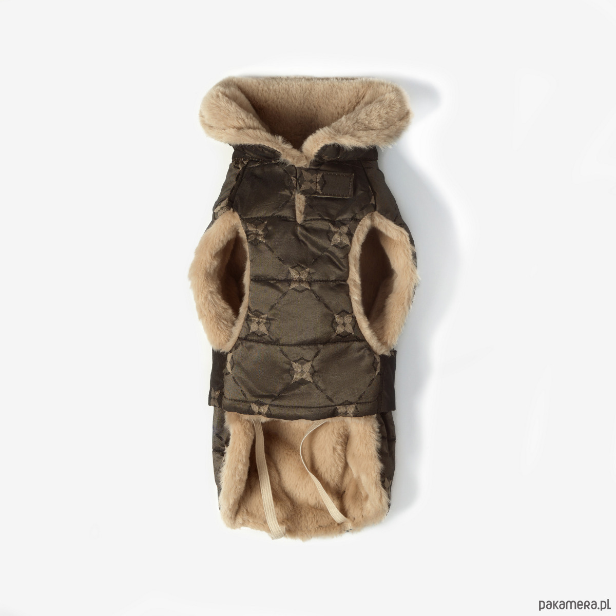 Model został zaprojektowany tak, aby chronić klatkę piersiową i brzuszek przed zimnem, jednocześnie zapewniając swobodę ruchów podczas spacerów. Stały kołnierz z futerkiem dodaje ciepła i przytulności, a na karku znajduje się dyskretne otwarcie, umożliwiające przypięcie smyczy do szelek lub obroży.